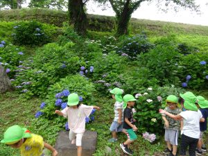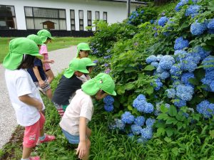 子どもたちの手から溢れるほど大きなあじさいを触り、楽しそうな様子です。