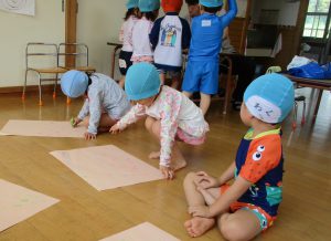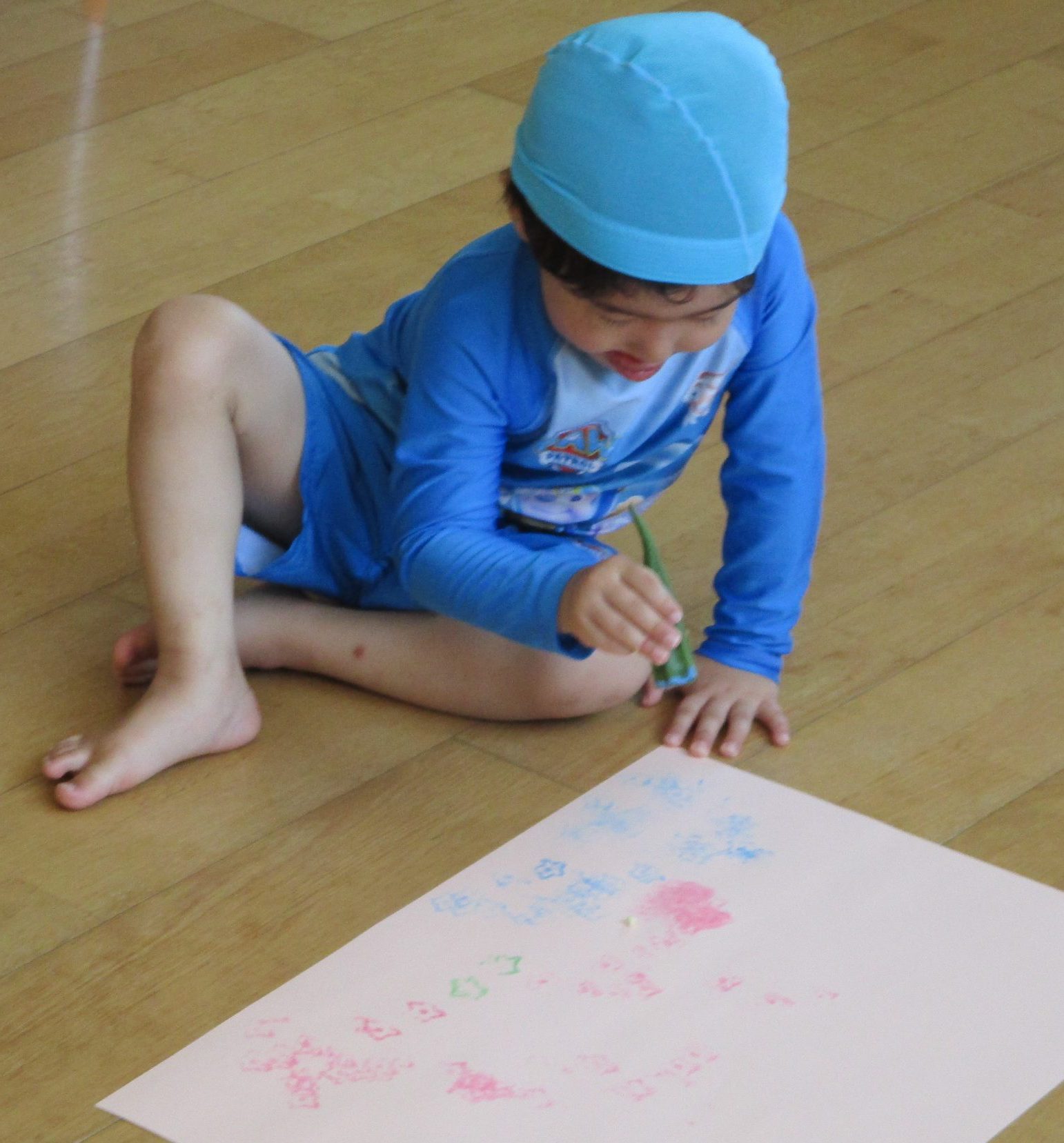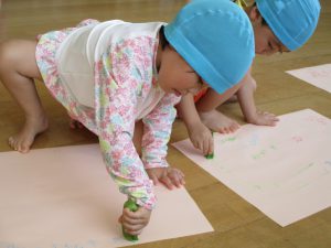 強く押したり、伸ばしてみたり、一人ひとりスタンプ遊びを楽しみながら、オクラの感触を確かめていました。