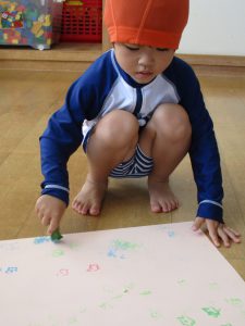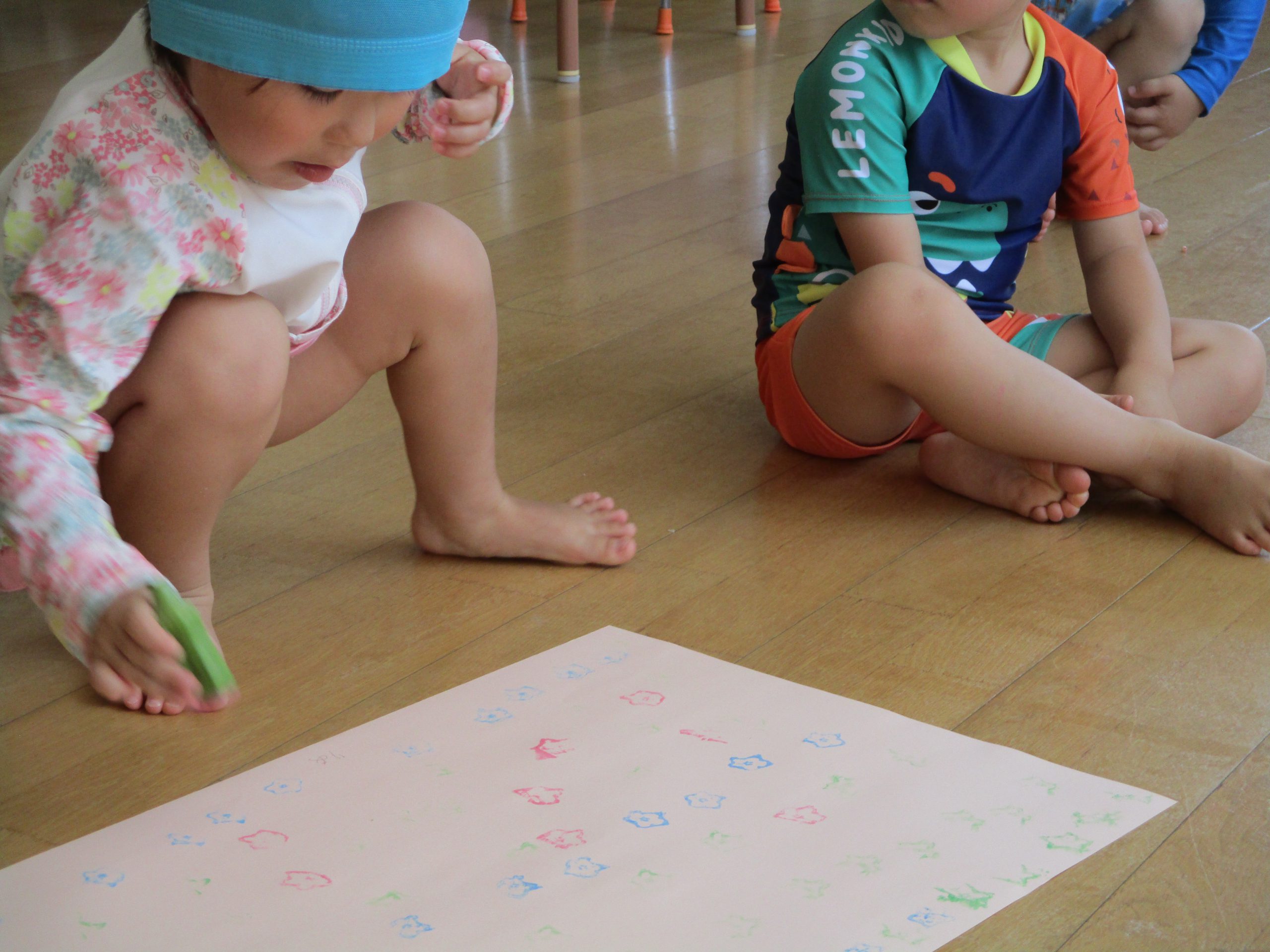 思い思いに表現するなかで、「この形、星みたい」という気付きが子どもたちから出てきました。また、「強く押すとどうなるだろう」「種も使えないかな」と、どんどん遊びを進めていました。