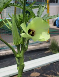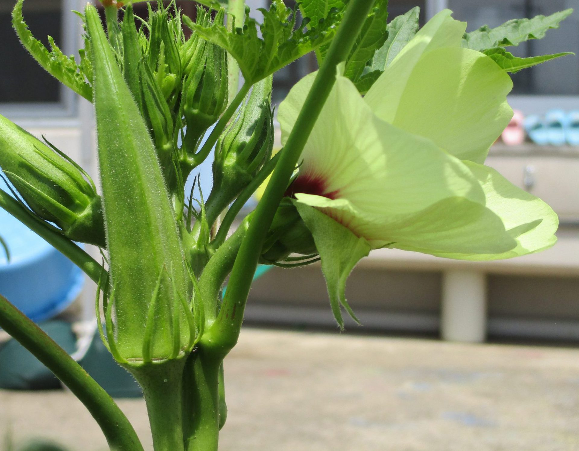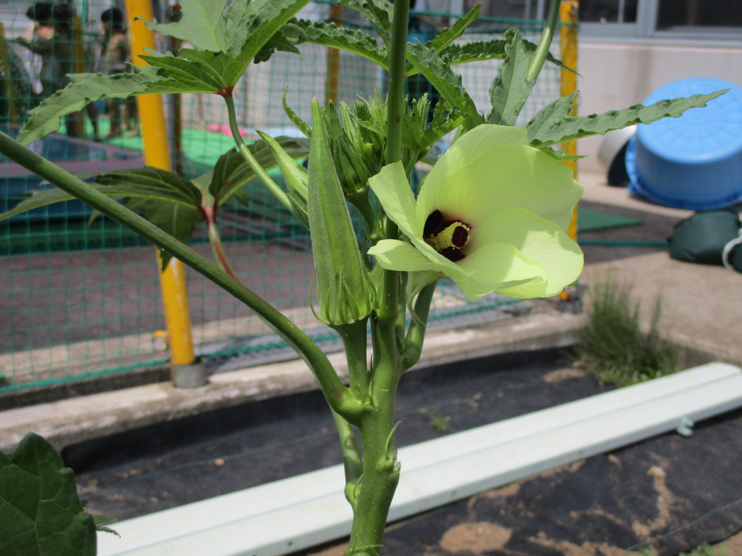 とがり保育園のオクラは、プールのすぐ横に植えてあります。