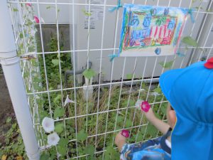 去年を思い出して色水を作ったり、雨どいで「アサガオ流し」