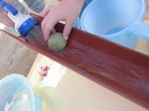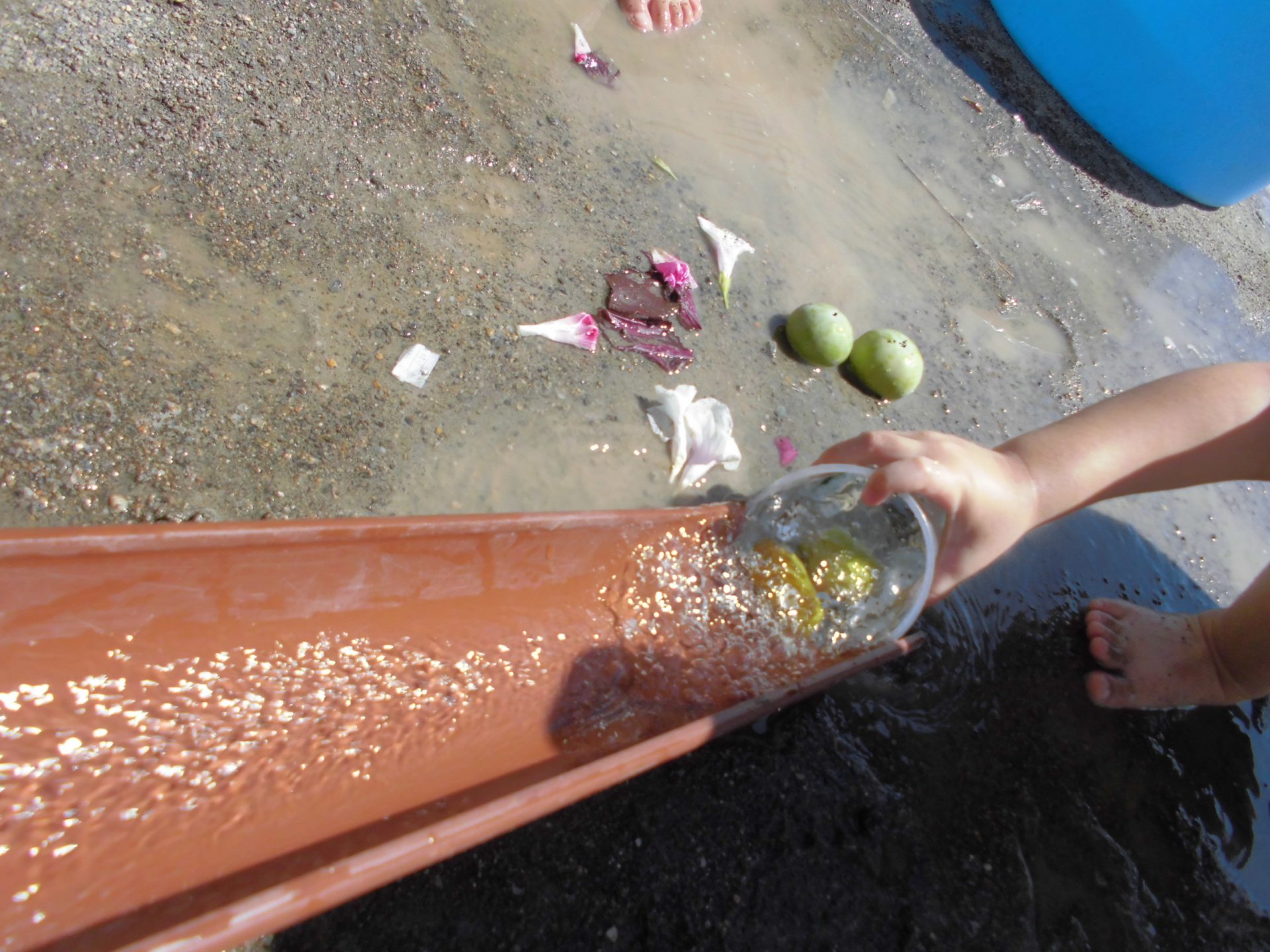 ・雨どいを使って、水と一緒に柿を転がした瞬間の「えっ!はやい!」という子ども達の反応がおもしろかったです。子ども達は、何度も繰り返していろいろ試してみて、また次のアイディアが浮かぶんだなぁと思いました。