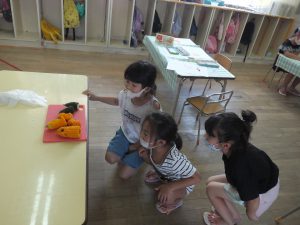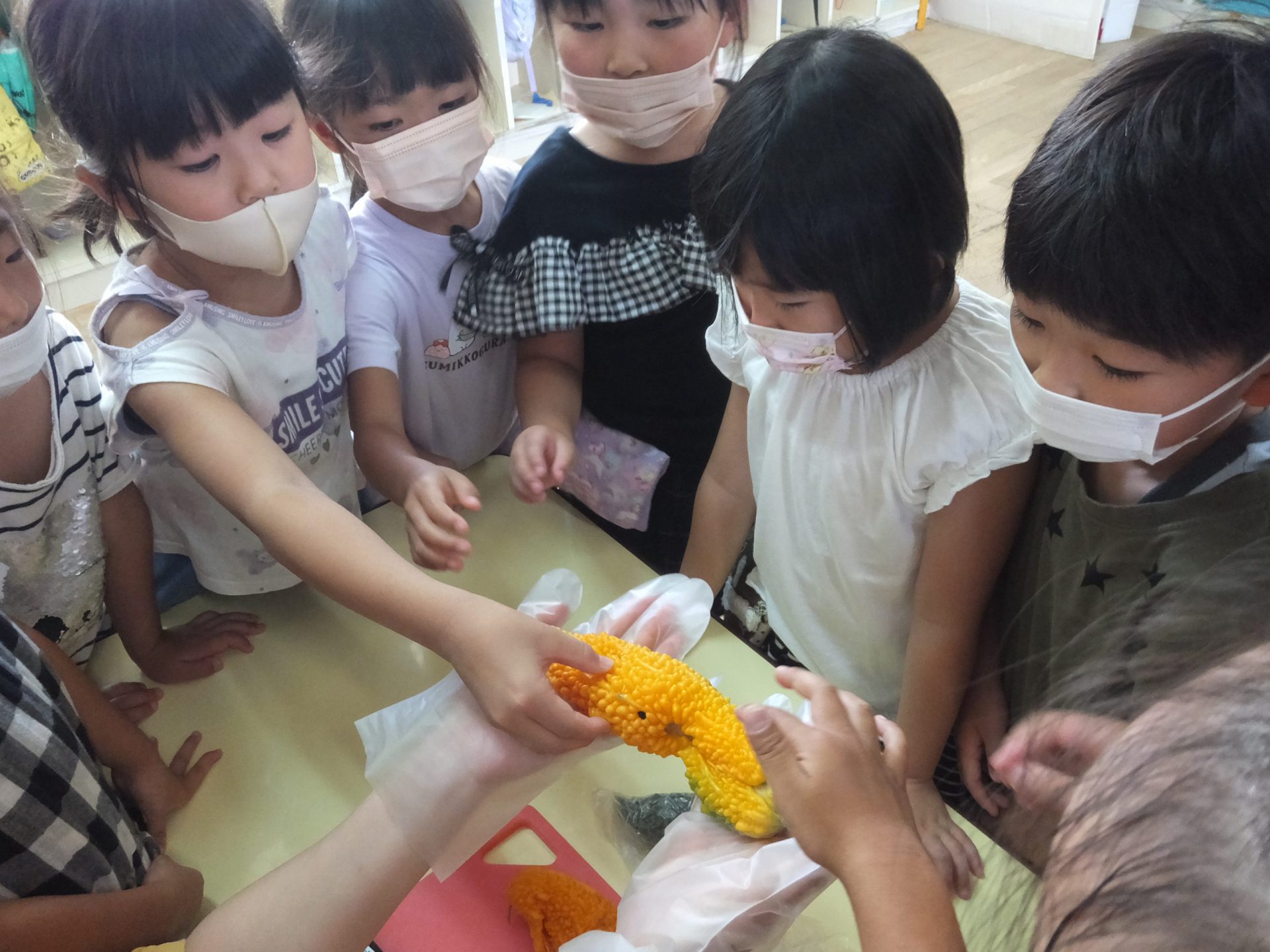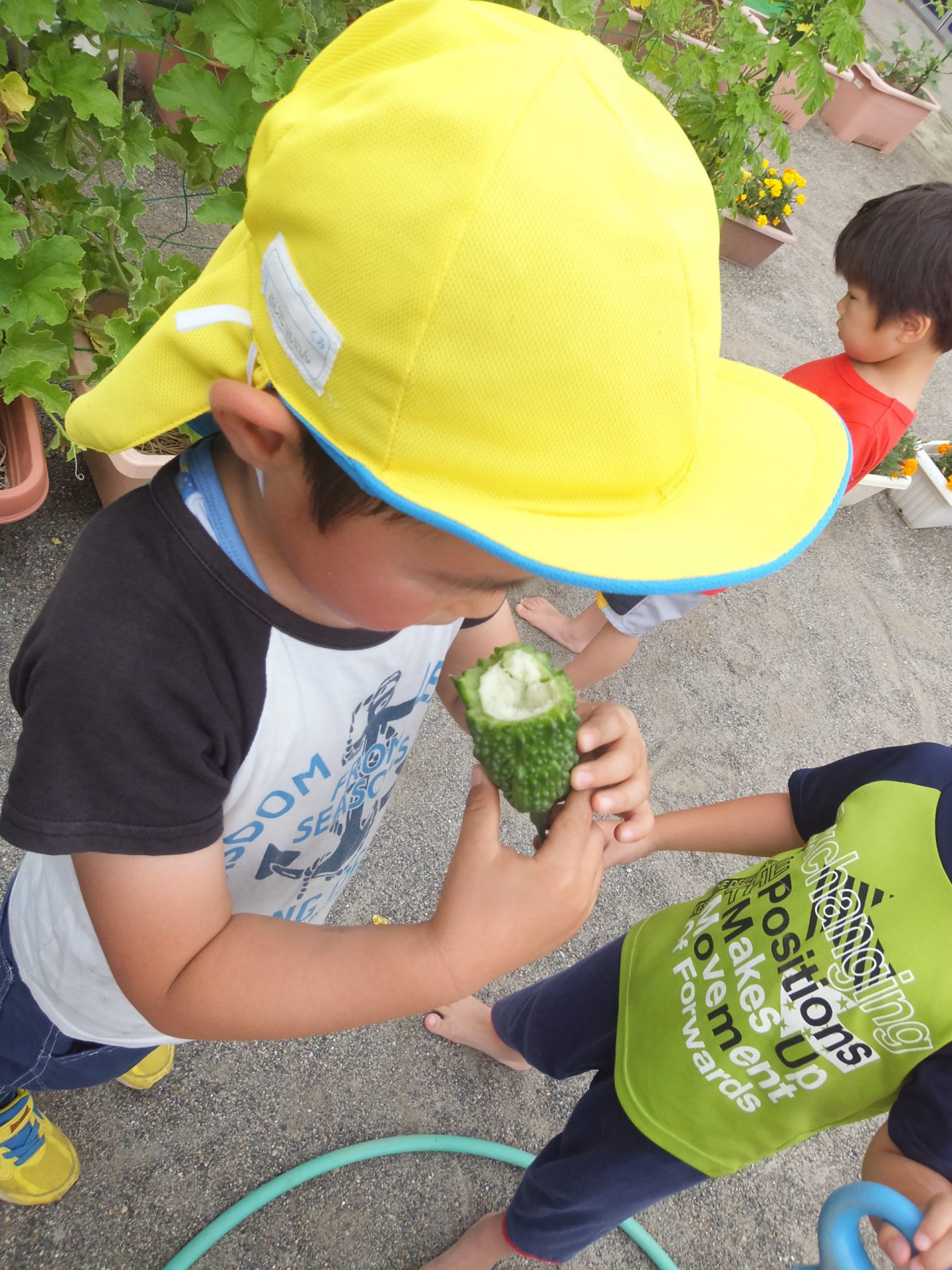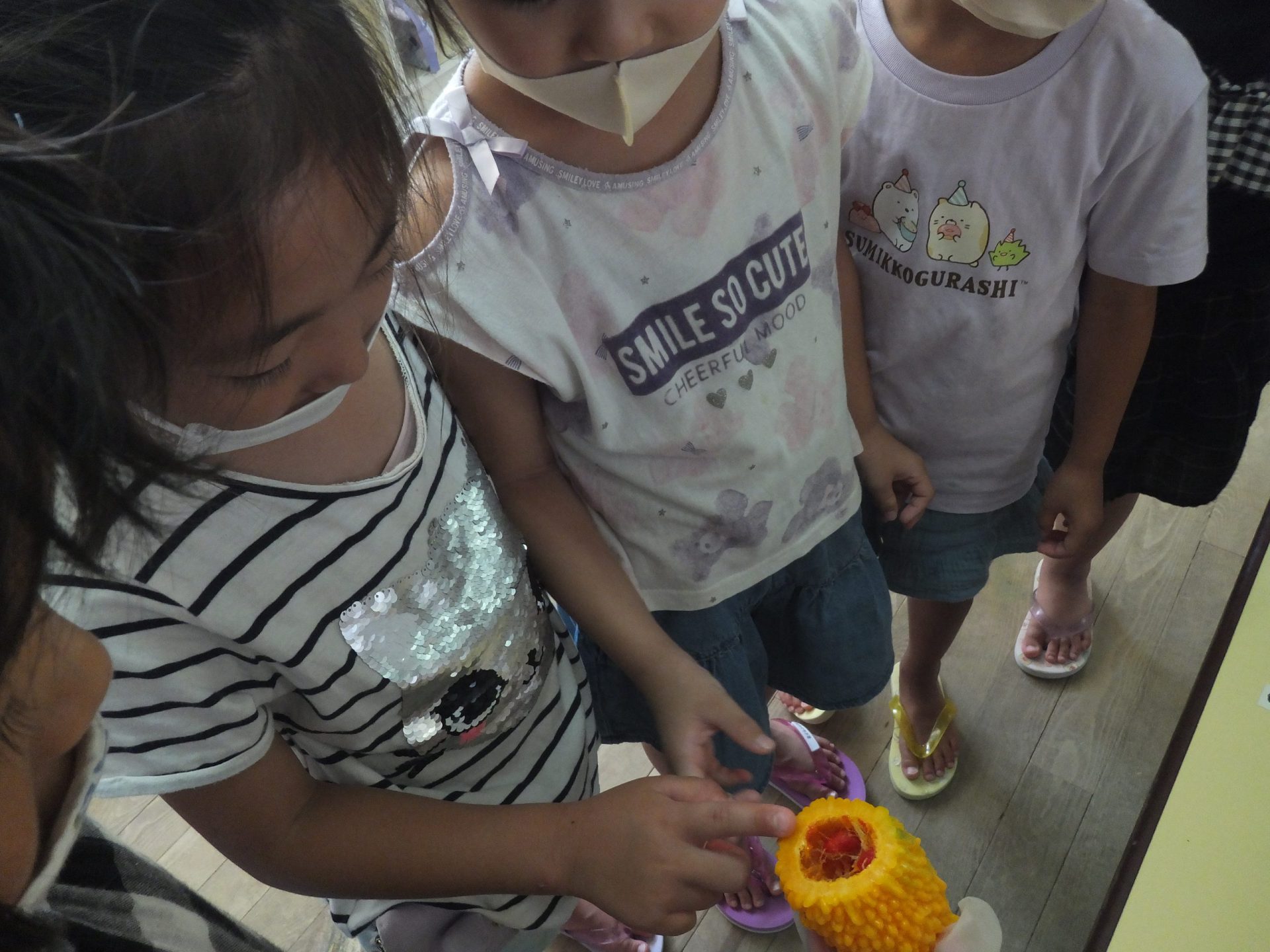 保育士は、黄色いゴーヤの中身を手に取って、子どもたちに見せてみました。触るのはやはり、抵抗があるみたいです。