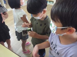 「中を触ってみる?」と保育士が聞いてみますが、「やだ!」と抵抗がある様子です。