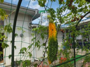 ゴーヤの水くれを行っていると、緑とオレンジの2種類のゴーヤを発見しました。
