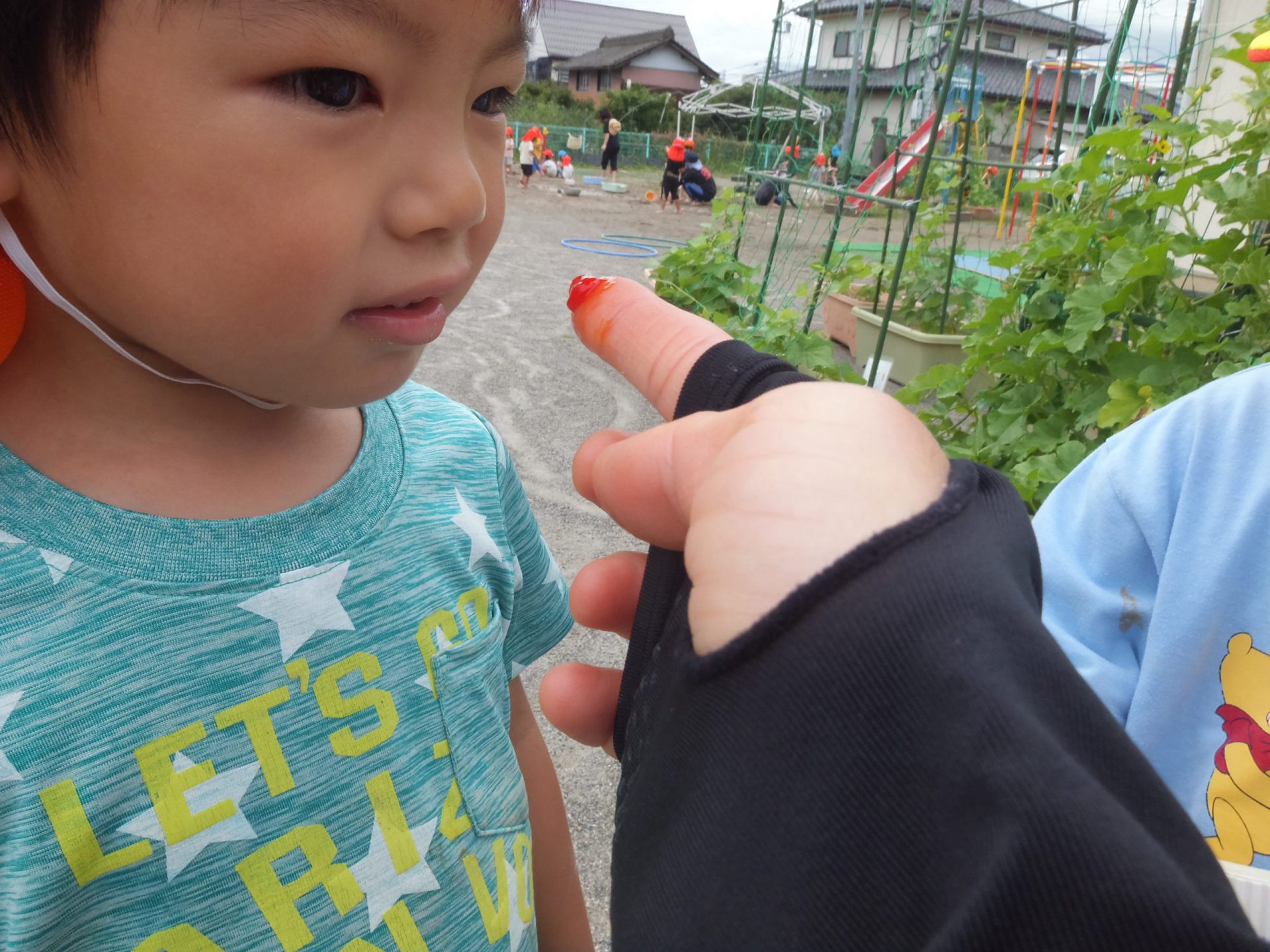年少のDちゃんは、緑のゴーヤにも、赤いのが入っていると思った様子です。