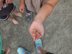 ふわふわをもらった年少のDちゃん。ふわふわをむいてみると中から出てきたのは・・・「これ、種だよ!」種を発見!!!