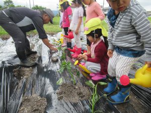 苗の植え方を教えてくれるのもじぃじ先生!みんなで美味しく育つよう真剣に話を聞いて植えています。