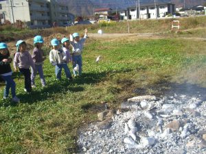 「おいしくなーれ!」熱々の日の中におイモをポーン!
