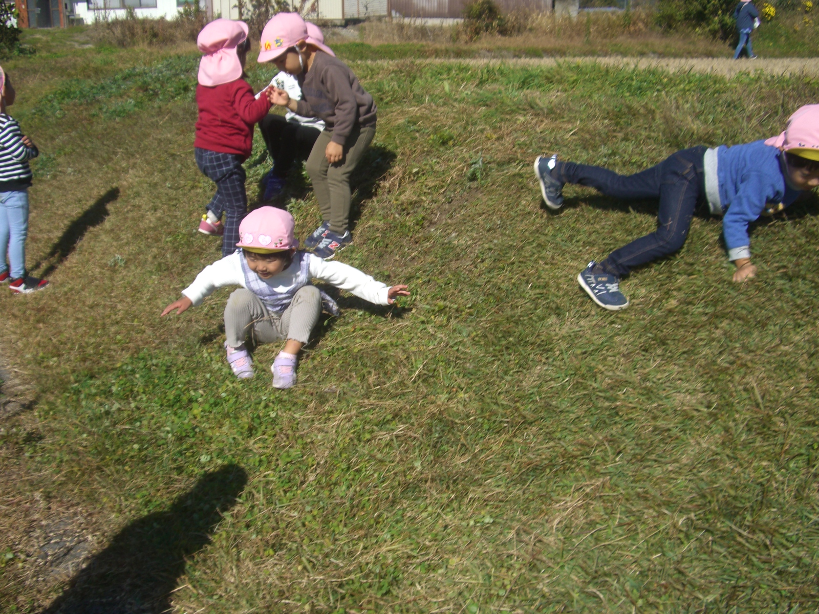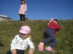 近くの土手で遊びながら、出来上がりを楽しみに待っています。