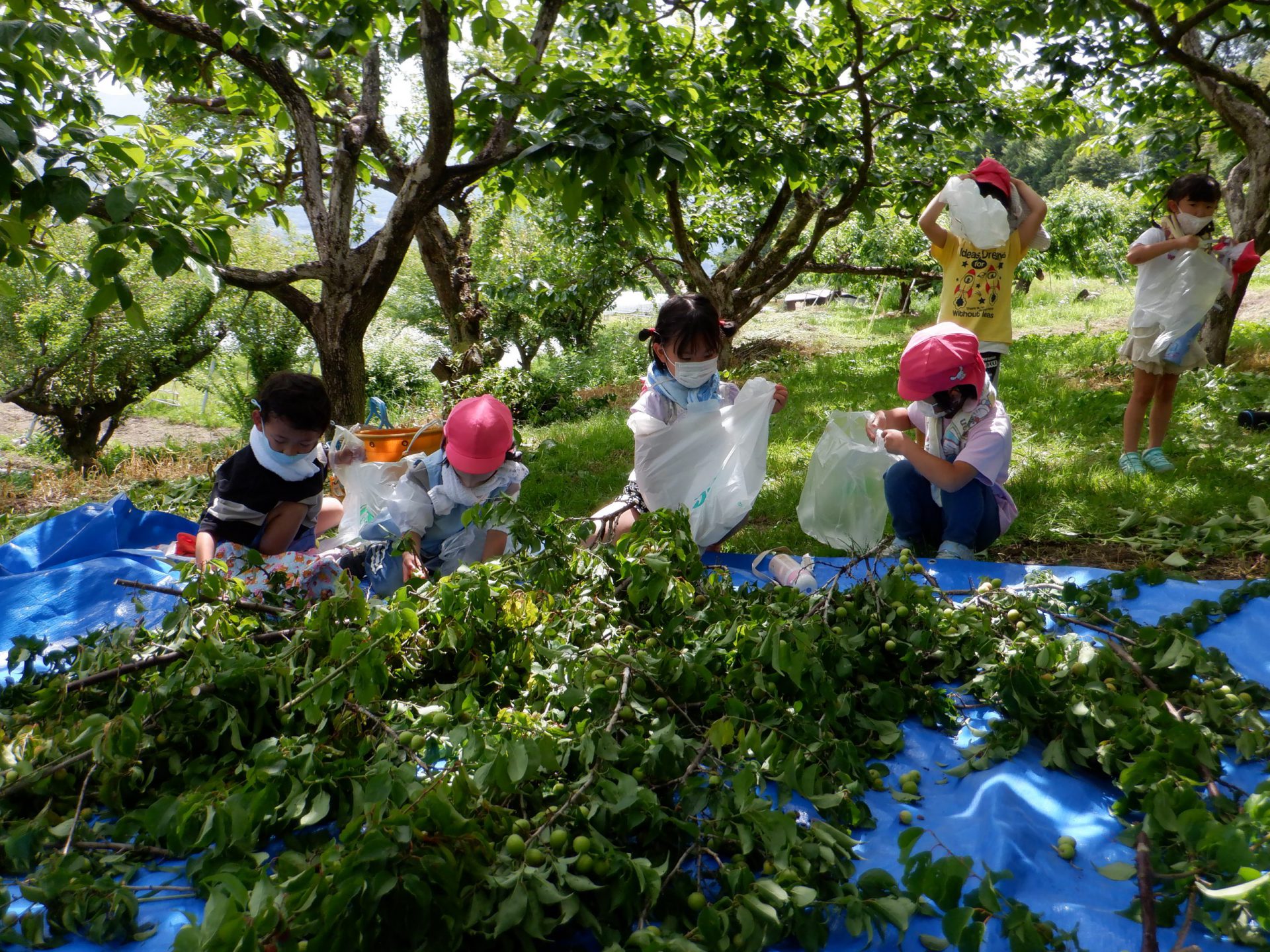 梅がついた枝を切り落としてくれ、皆で梅拾い。