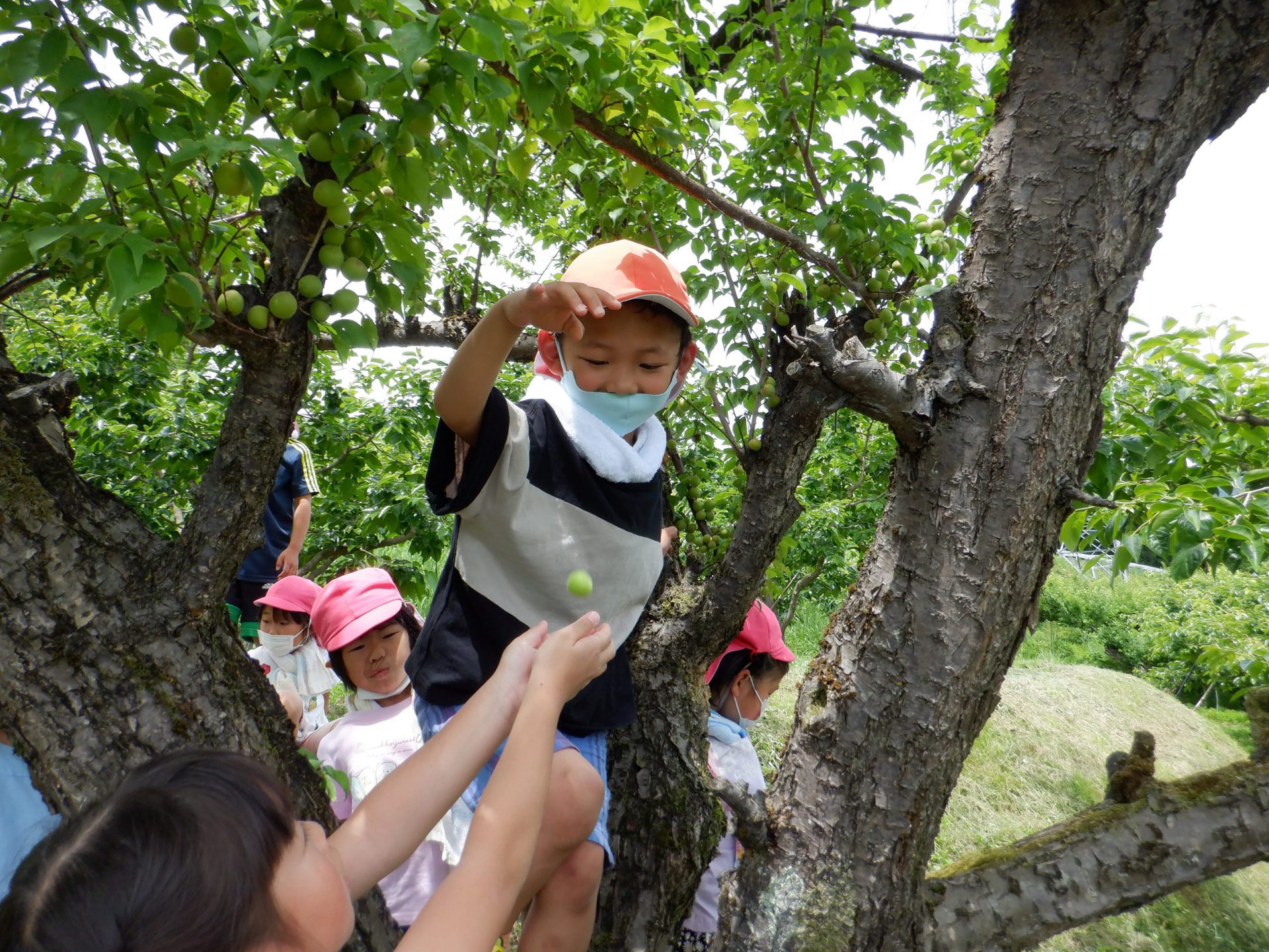 木の上に登って梅採り体験。「うけとって~~~」