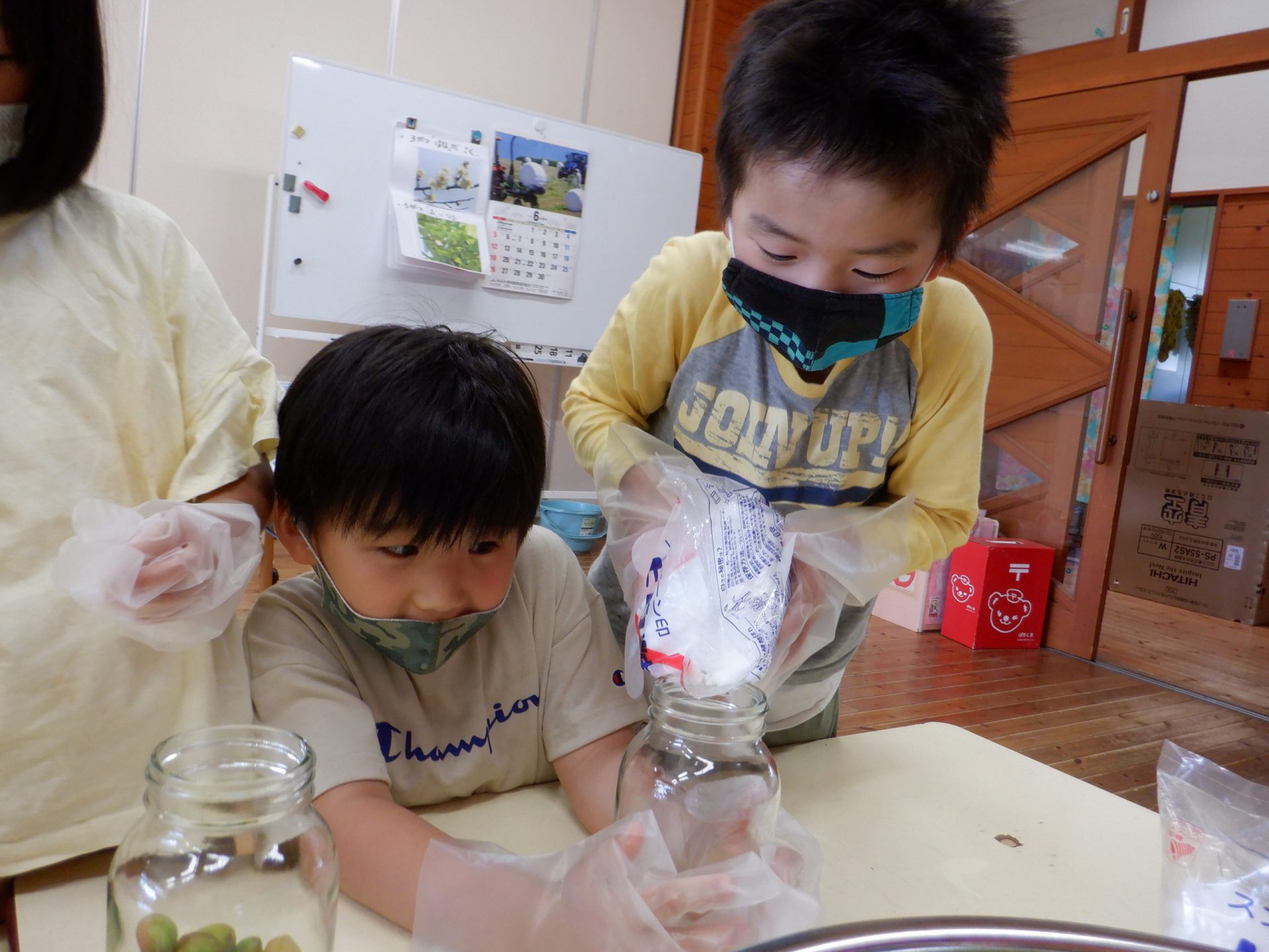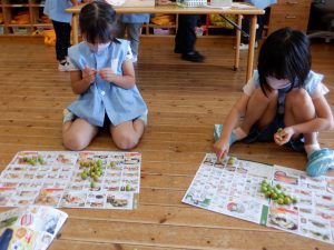 ・昨年の年長が作ったジュースを飲ませてもらった経験から、「今度は自分たちが作りたい。」と始まった。作業はとても根気のいることだが、おいしいジュースを作りたいと、頑張って取り組むことができた。
