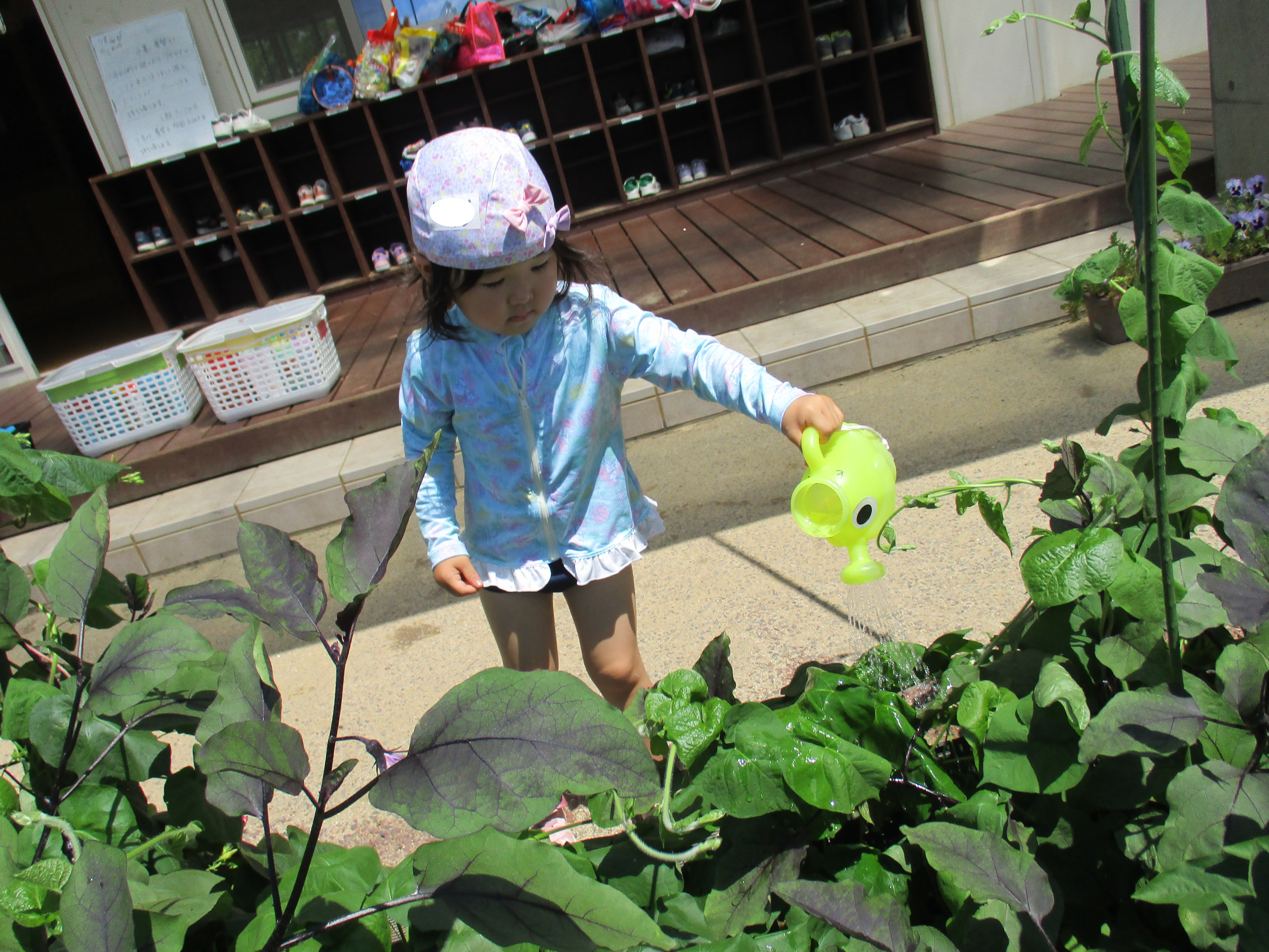 「なすにもアサガオにもお水をあげなくちゃ!」「いっぱいお水のんで大きくなってね!」