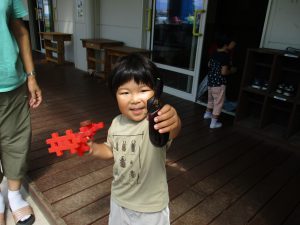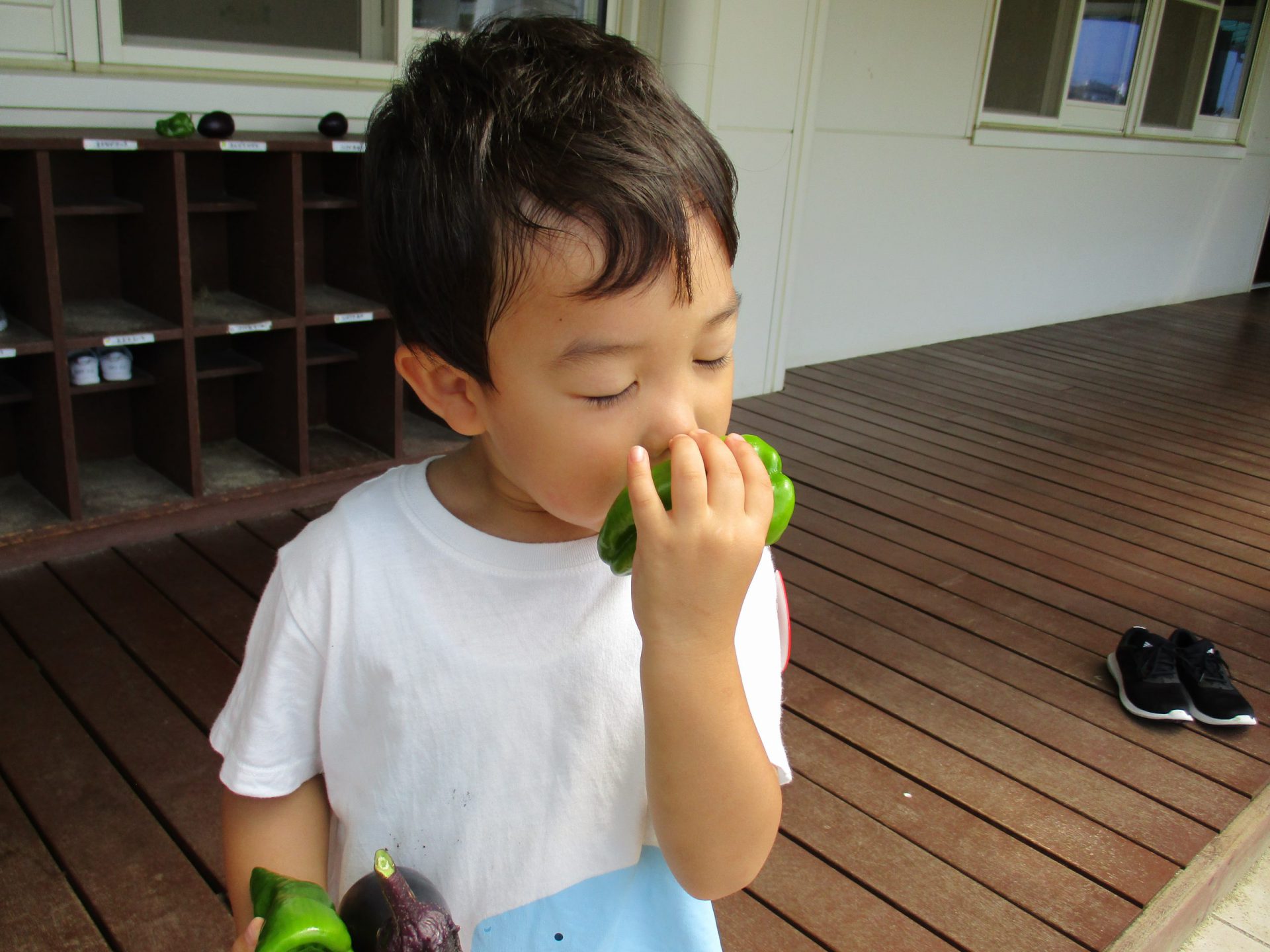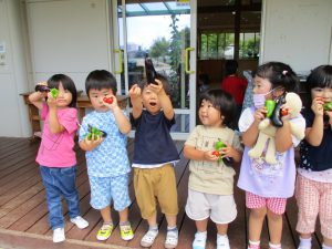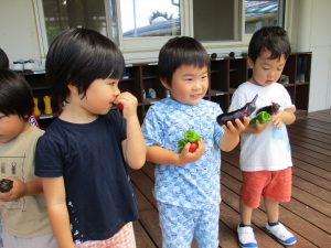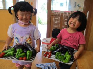 5月にみんなで野菜の苗を植えて、生長の様子をみてきました。子どもたちが花の色と実の色が同じナス、違うピーマン・ミニトマトに気づいたり、いつが食べ頃なのか話し合ったりする姿も見られました。自分たちで育てた野菜に愛情を持ち、野菜を狙っているカラスを追い払う姿もありました。