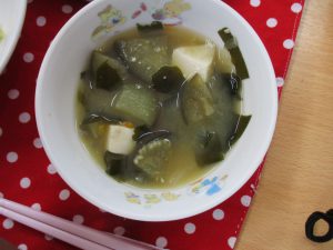 給食の先生が、採れたてのなすをおみそ汁に入れて調理してくれました。