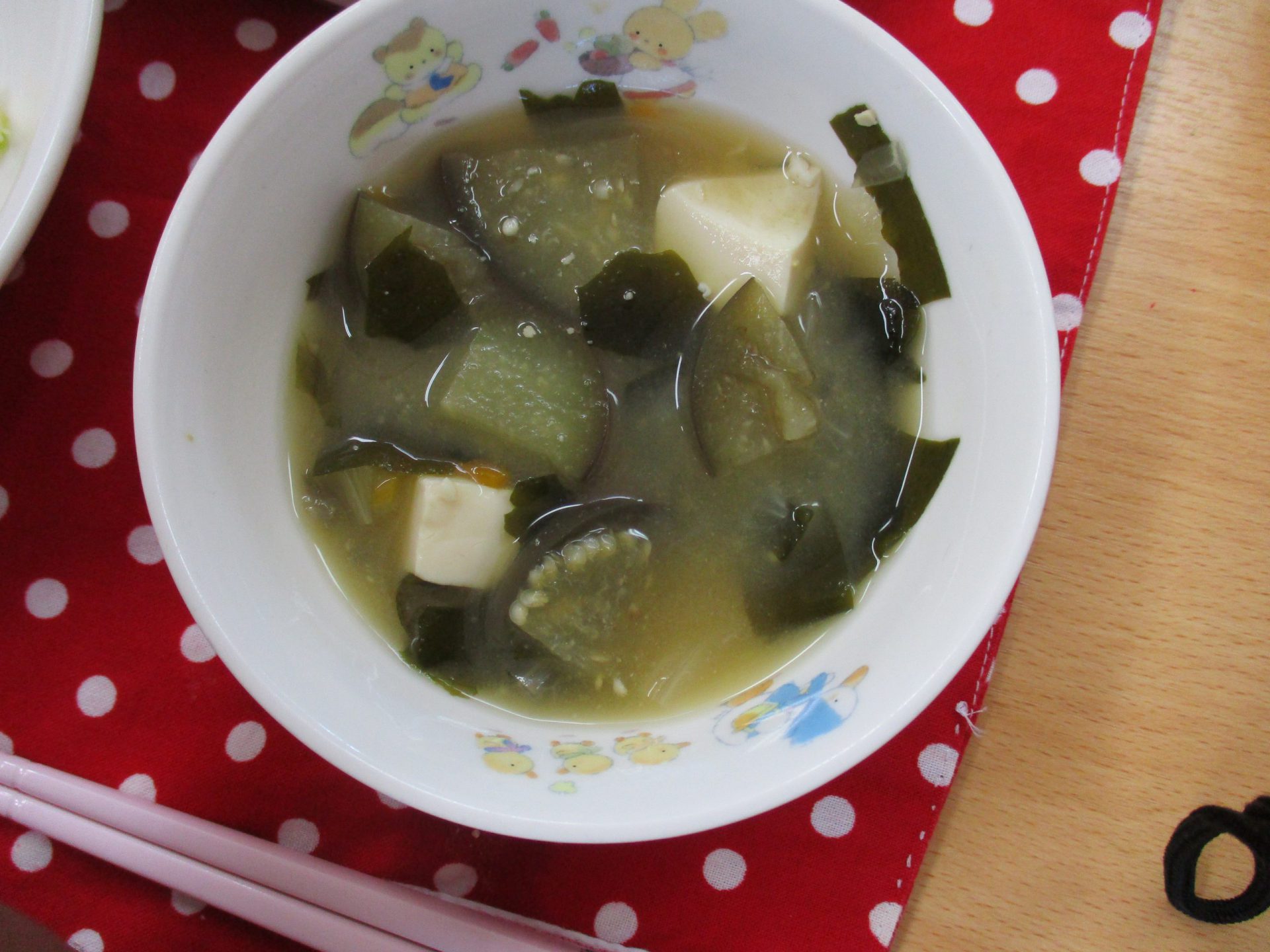 「りすぐみの畑でとれたなすが、おみそ汁の中に入ってるよ」