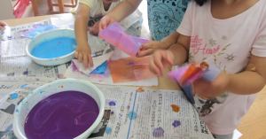 年少さんは絵の具で和紙を染め、それを水を溶かして色水遊び。
