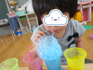 色つきの石鹸水をぶくぶくしてソフトクリーム作り。