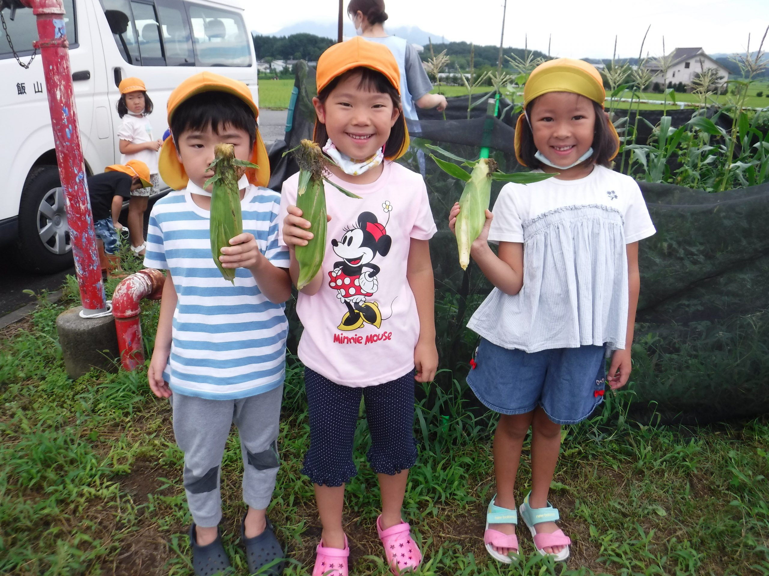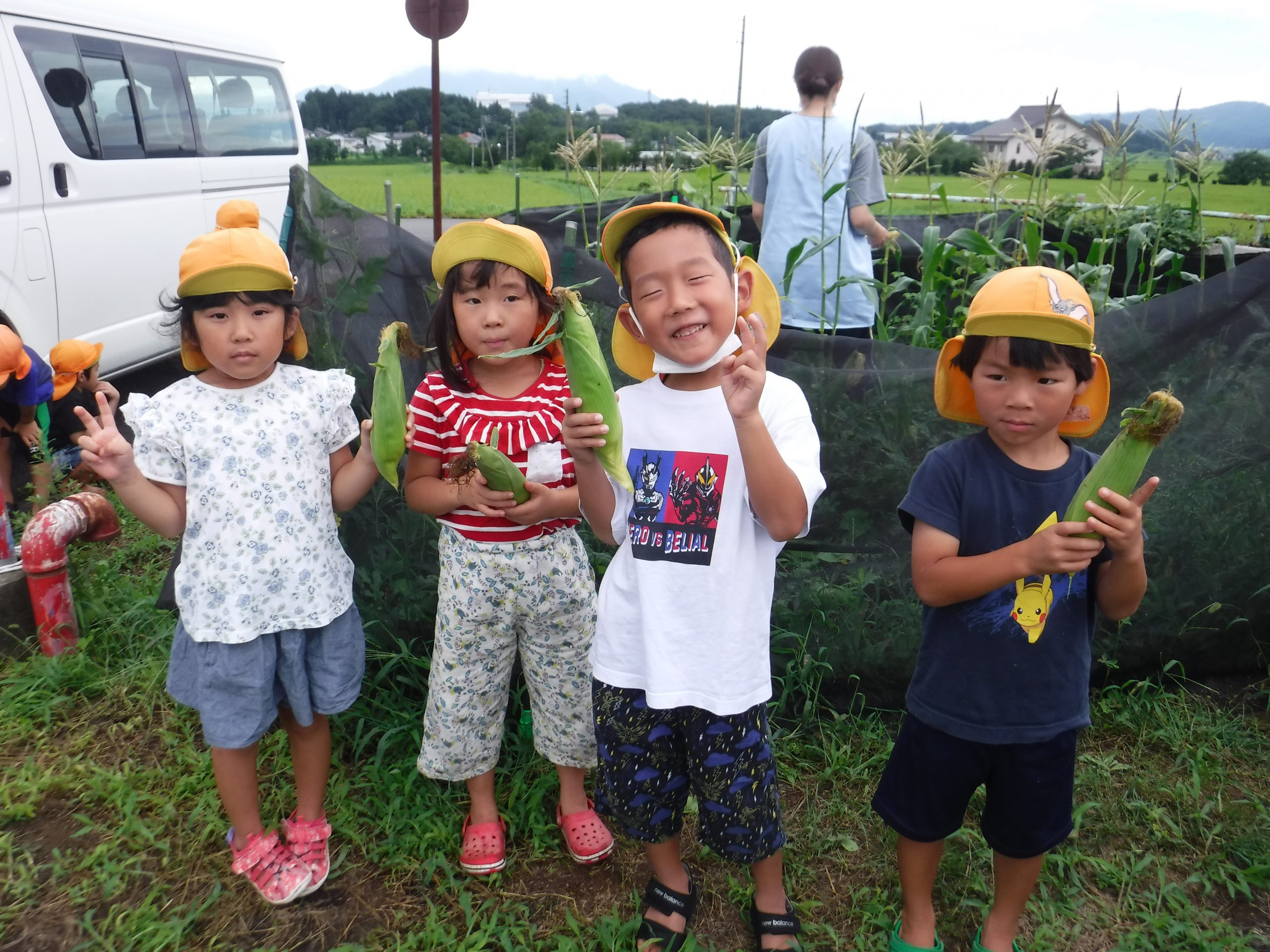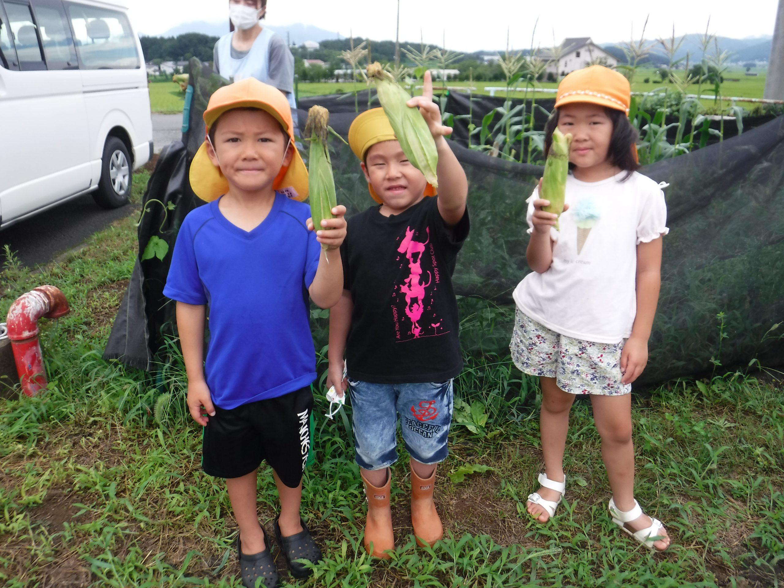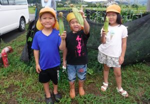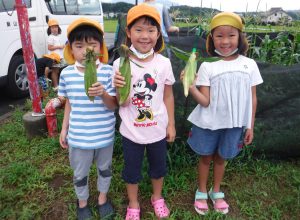 お盆休み明け、茶色くなったともろこしのひげを見て、「もうとれる!」と嬉しそうな子ども達。