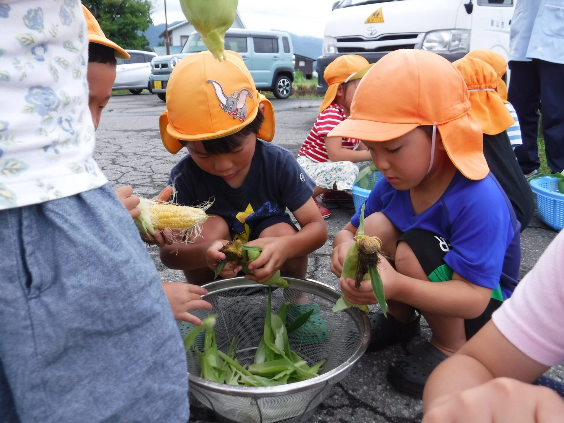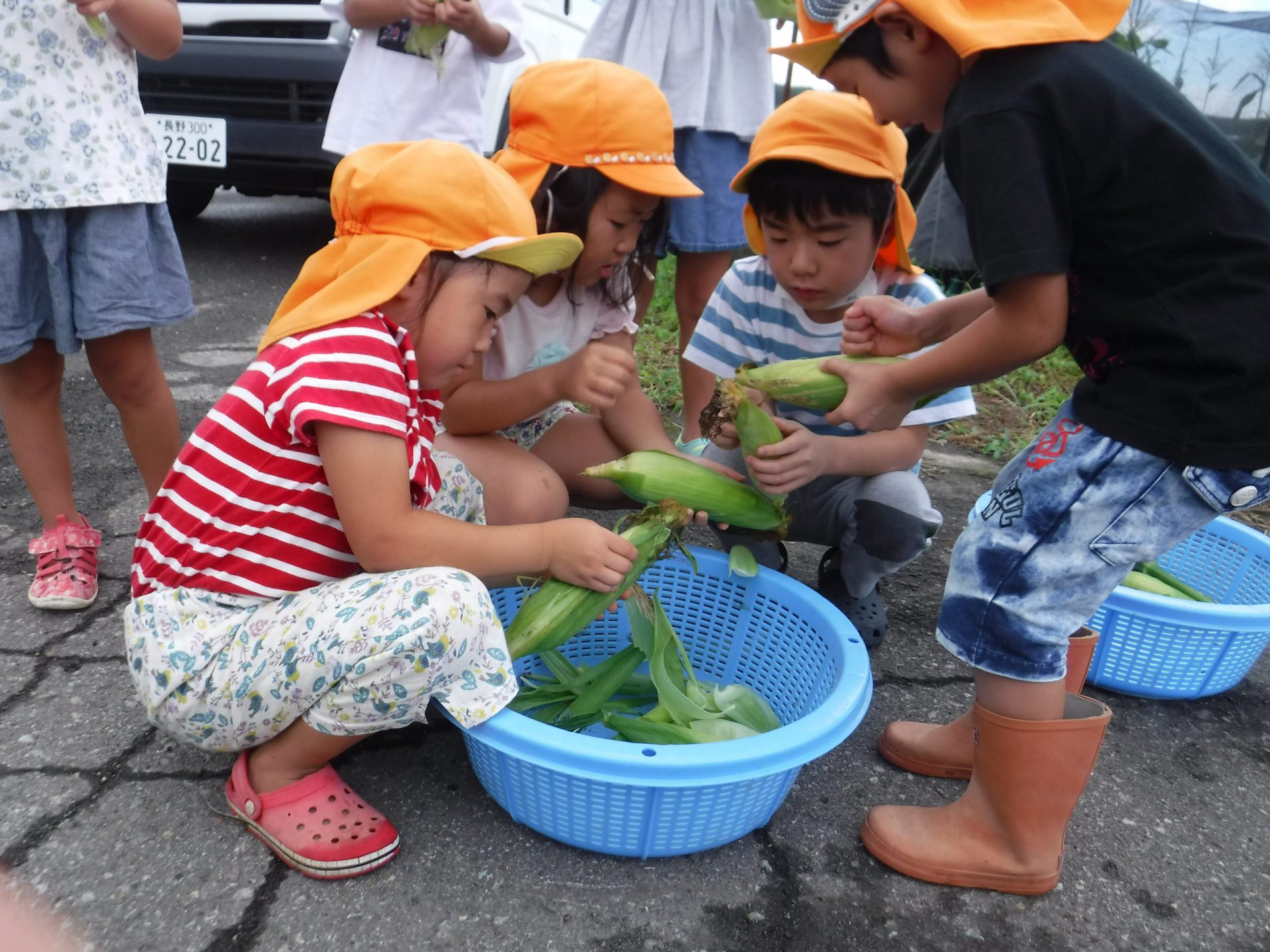 収穫して、「つぶつぶが大きい!」「このもじゃもじゃたくさんついてる〜」「皮むくの楽しい〜」