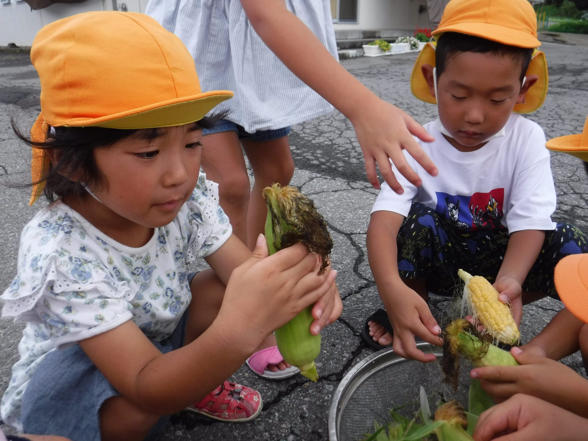 自分たちで育てたとうもろこし、どうなったら収穫してもいいのか興味を持ち、楽しみにしていました。