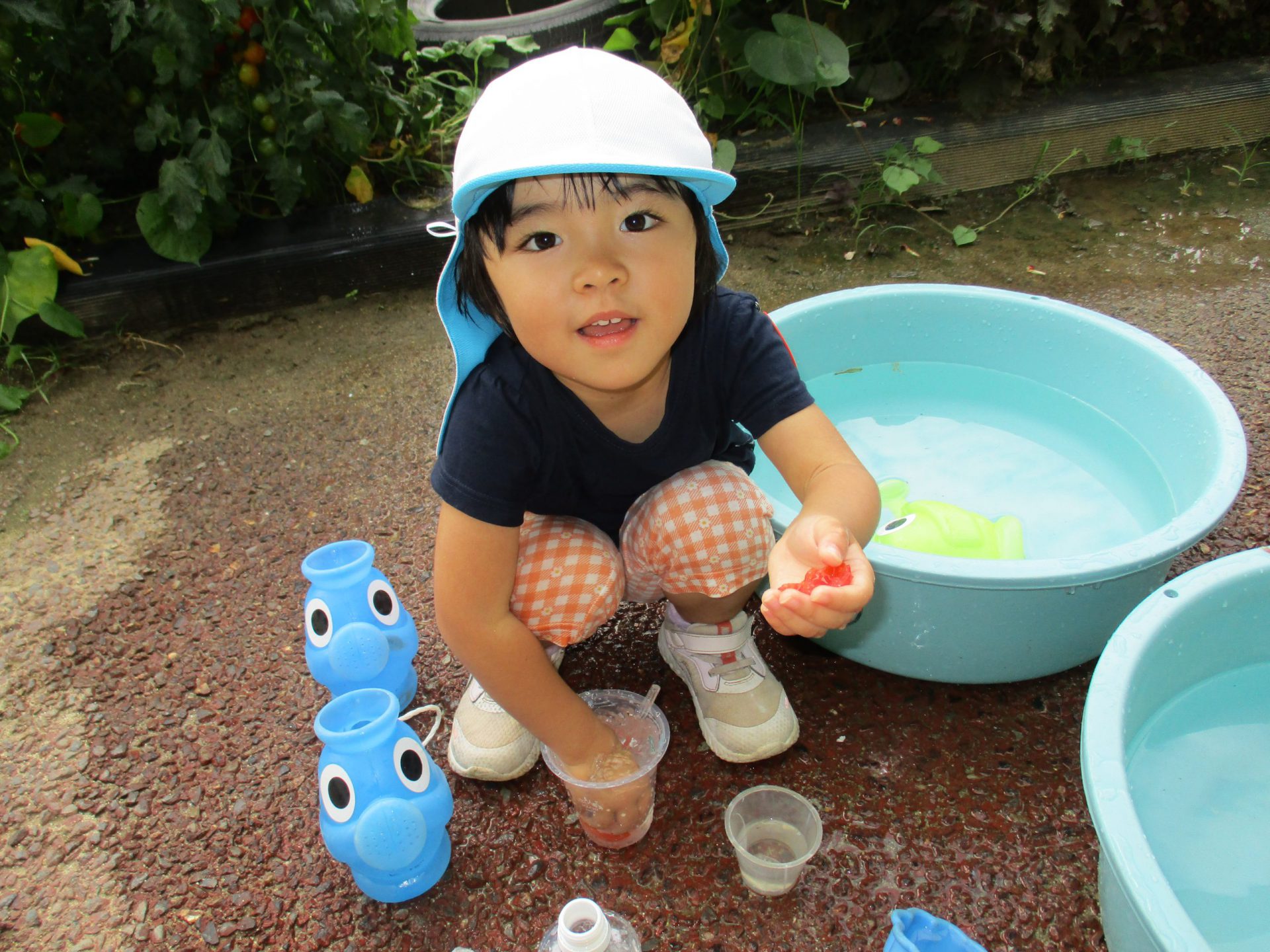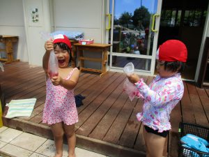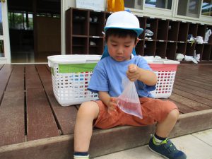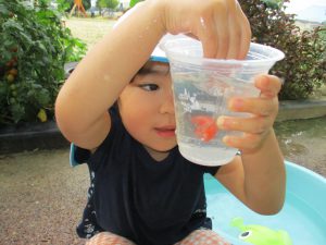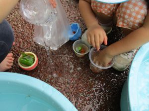 年中、年長さんの色水作りをしている様子を見ていた子ども達。「やってみたい!」と強い願いを持って始めた色水作り。