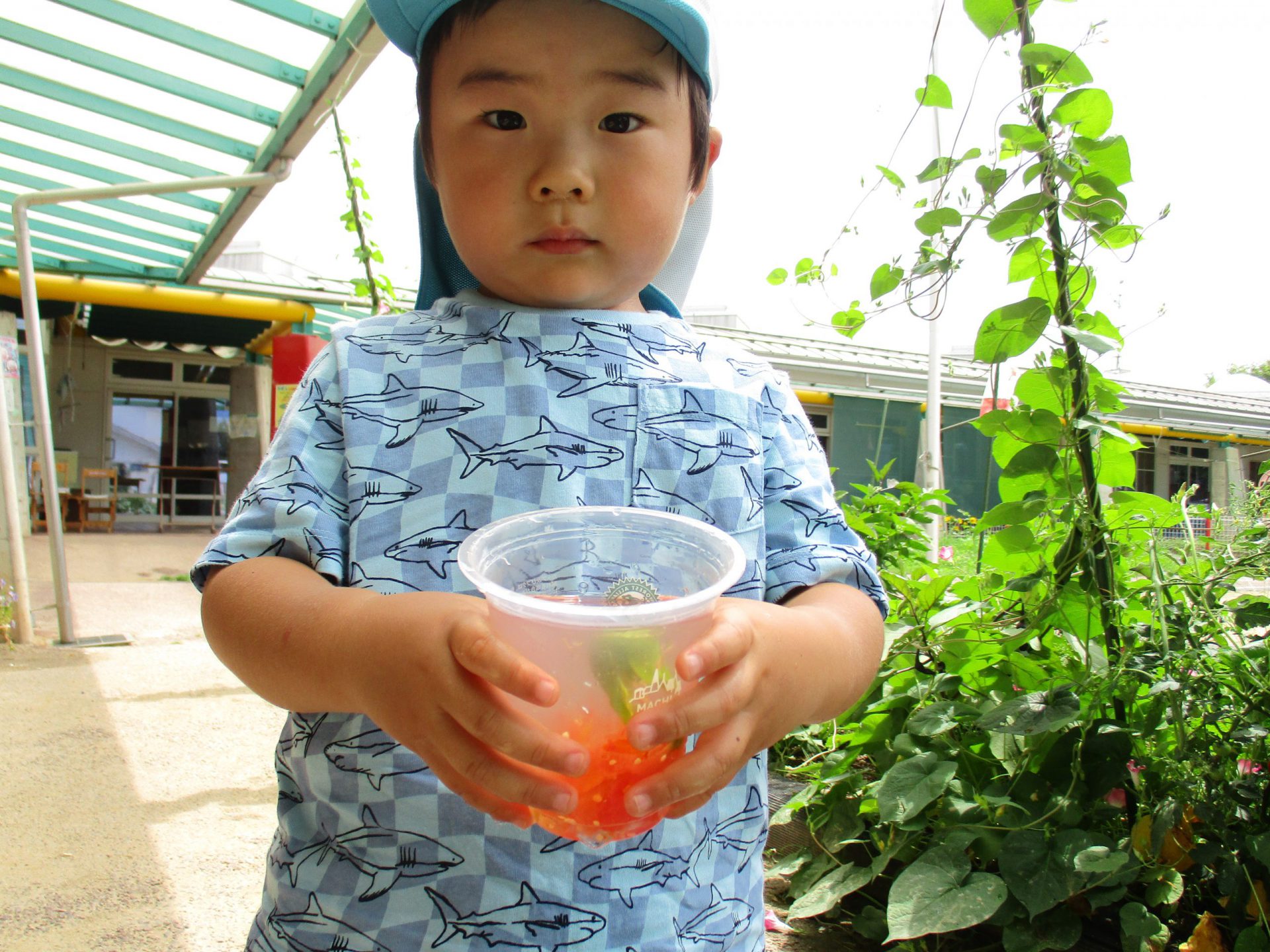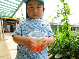 「畑にミニトマト落ちてたよ。これで色水作ってみよう!」