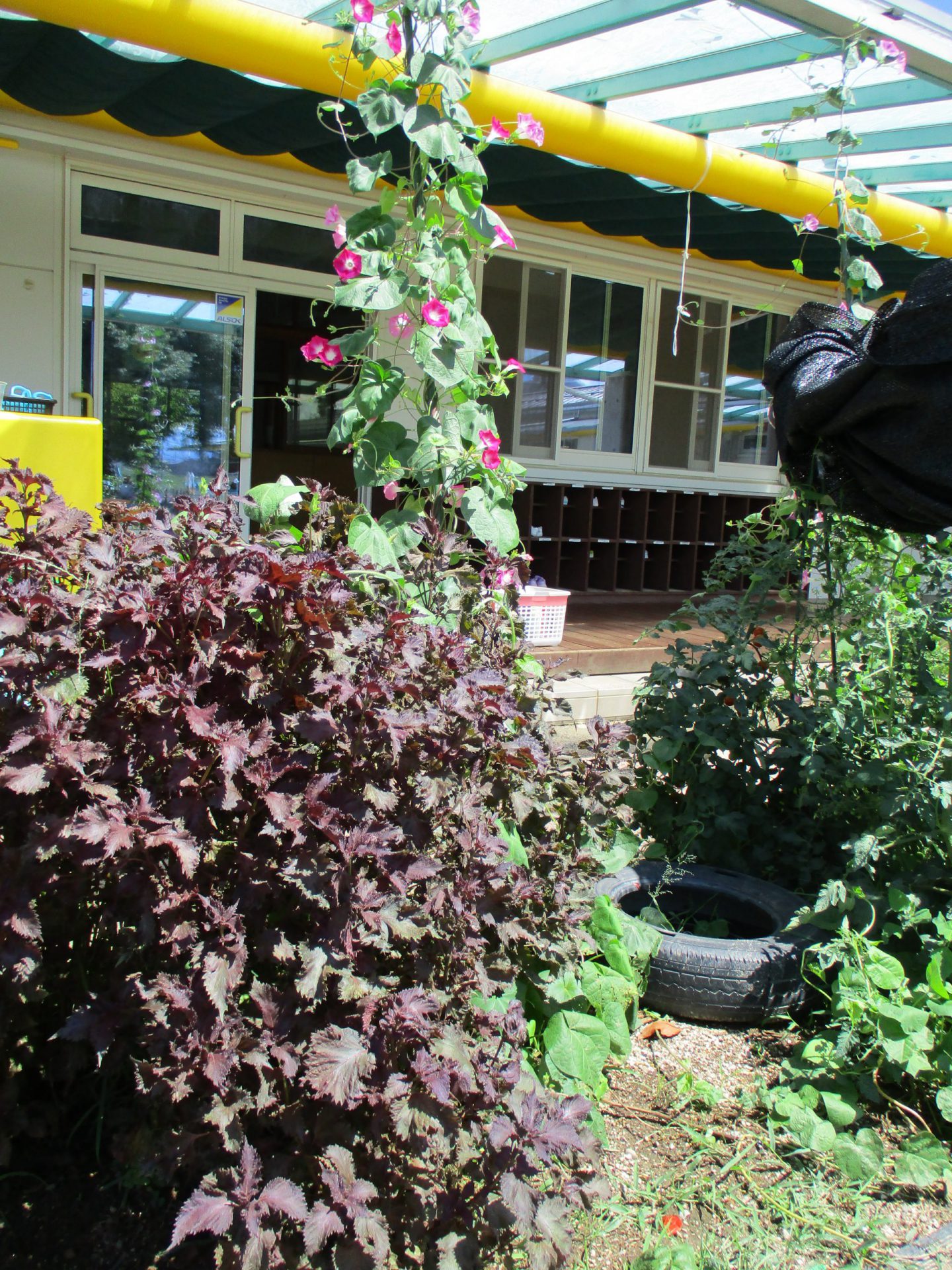 畑のシソがモリモリ大きく育ち、アサガオはグングン伸びて、たくさん花が咲きました。