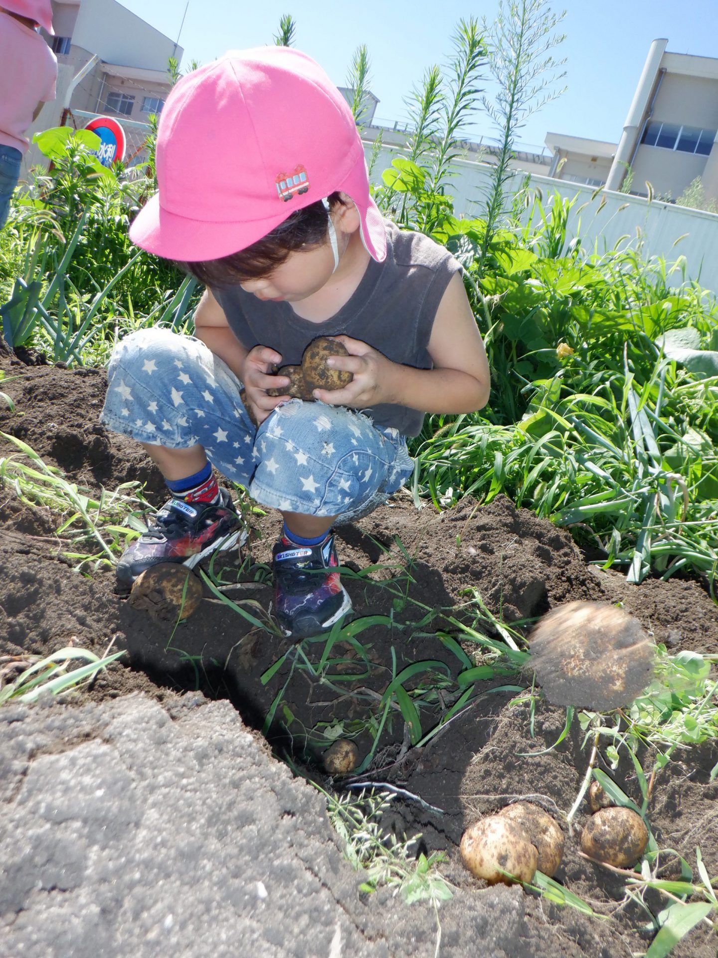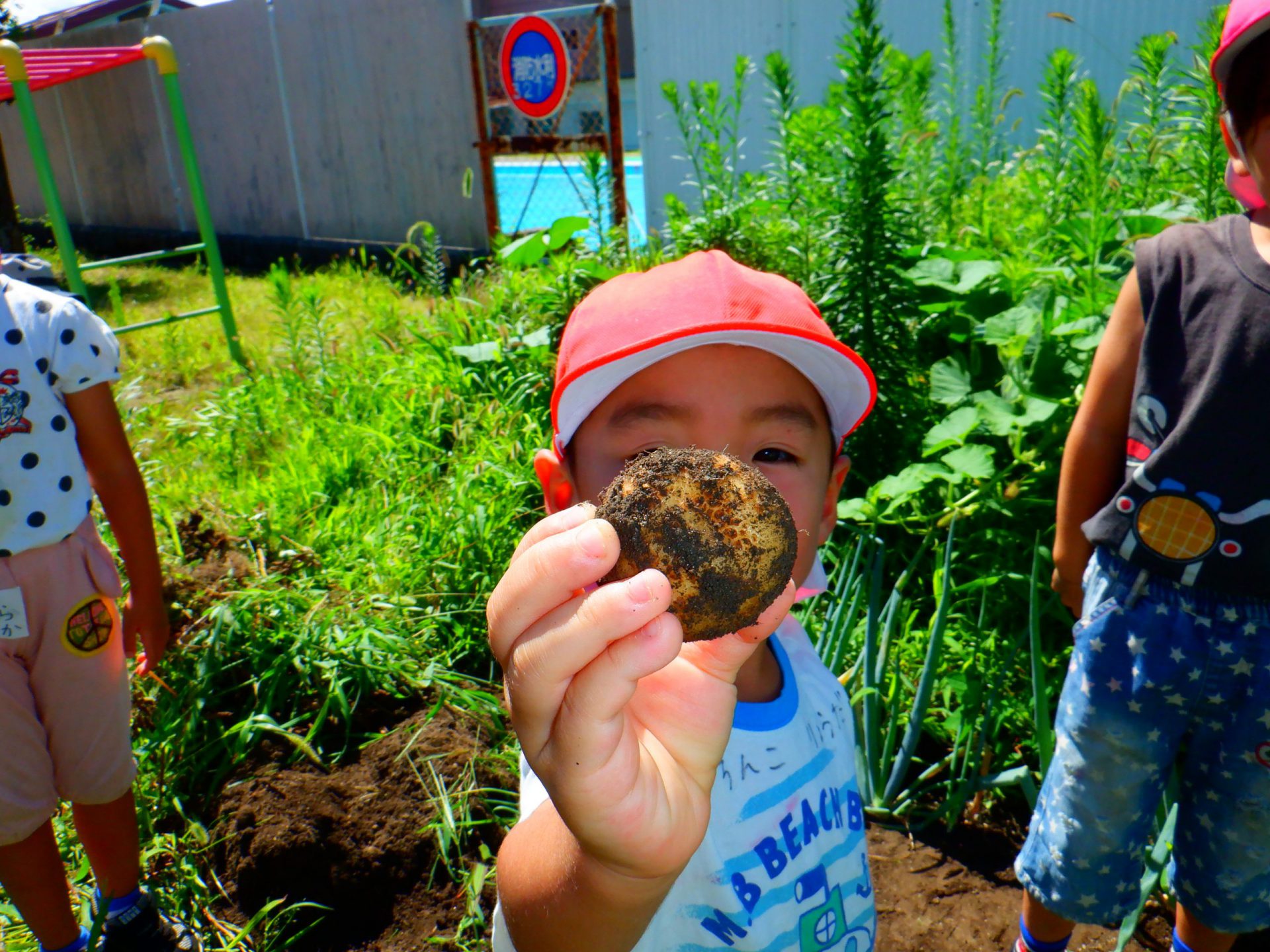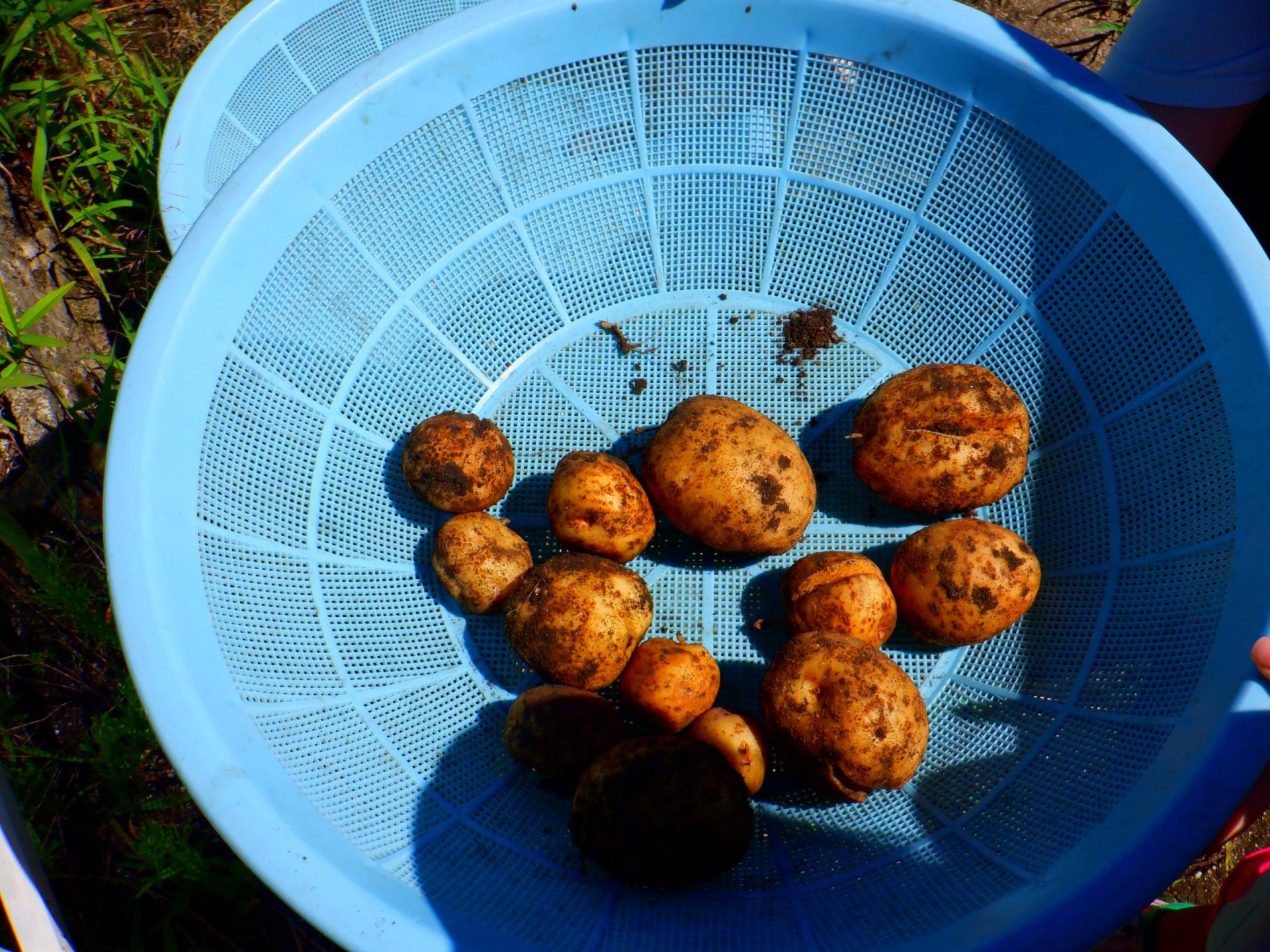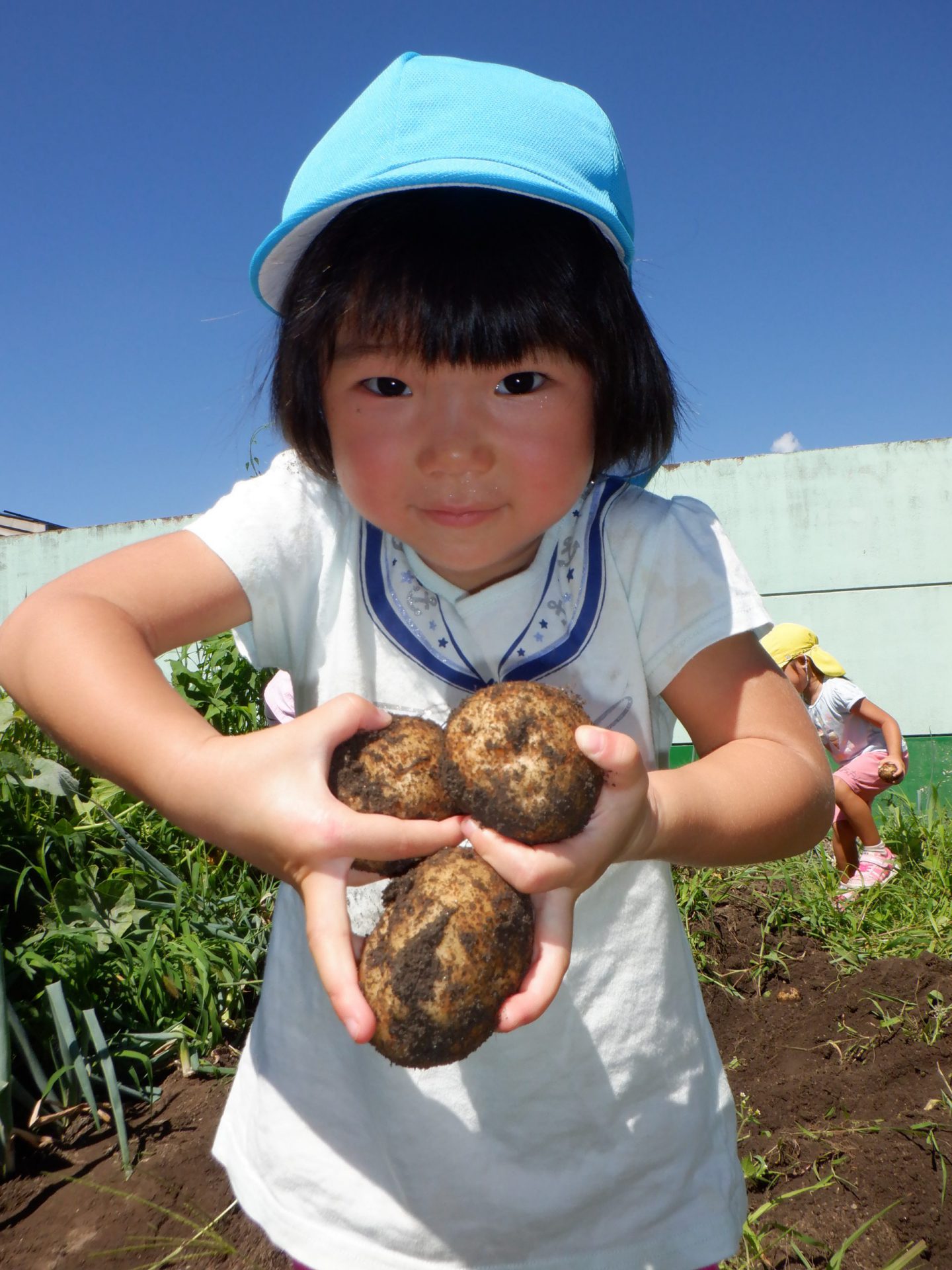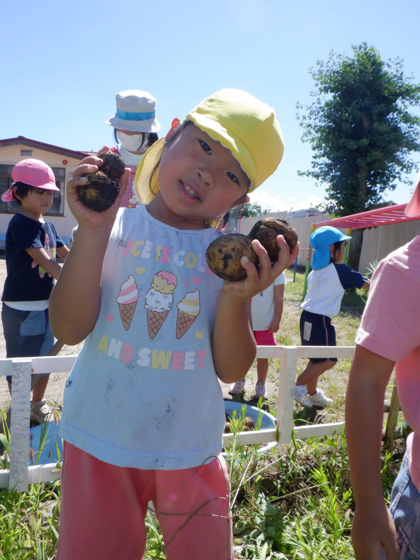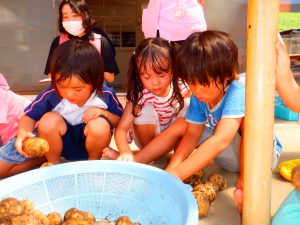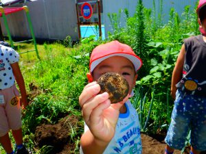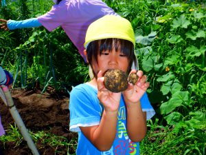 暑い中みんなでほったじゃがいも。土を手でかき分けながらじゃがいもを見つけては、夢中になって掘っていました。