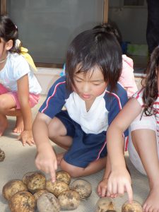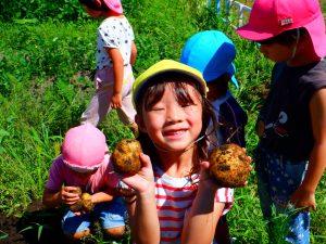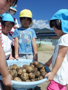 自分たちで大切に育てた「じゃがいも」掘ってすぐに給食先生がふかしてくれて、食べることができました。食育の取り組みとして園庭の畑で色々な野菜を育てています。自分たちが作った野菜を収穫後すぐに食す事で、「野菜のおいしさ」「食べ物の命をいただく」ということを感じることができています。