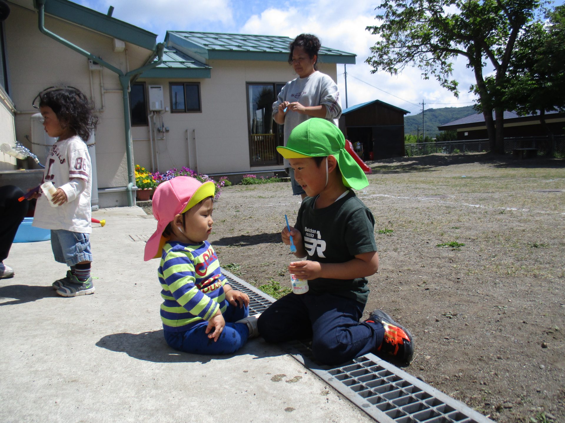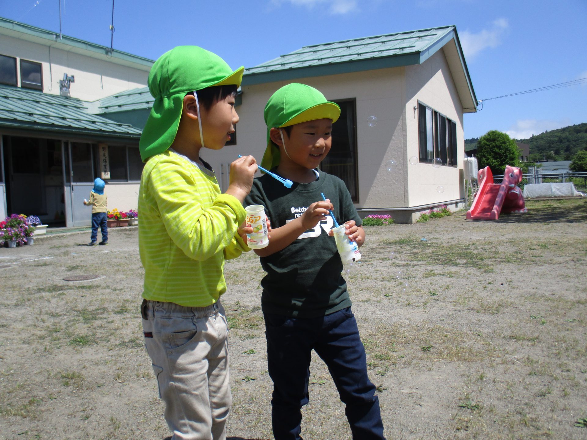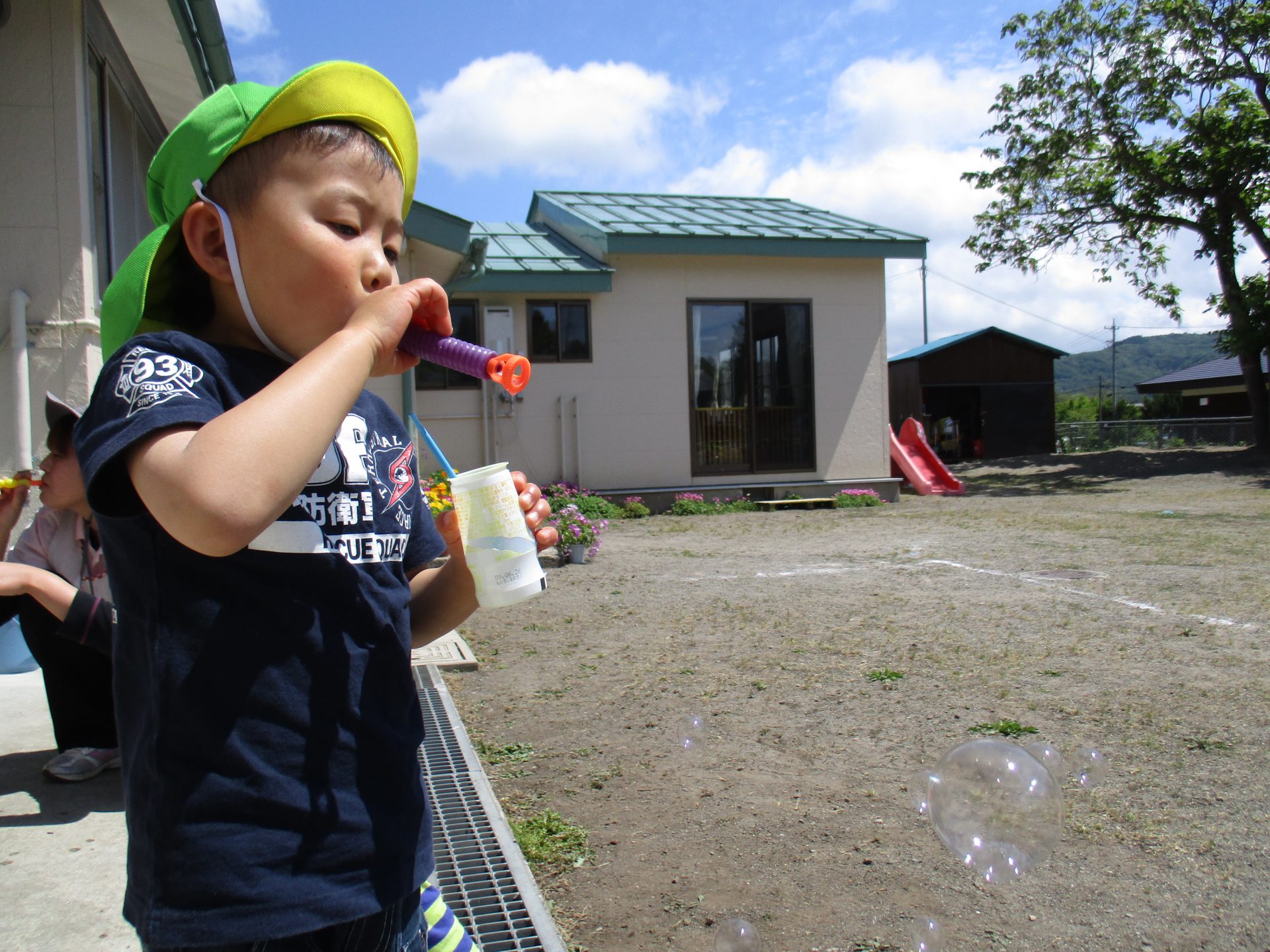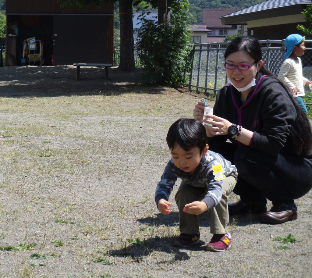 「見ててね〜」と、小さいお友達にシャボン玉を吹いて見せてあげる年長さんです。