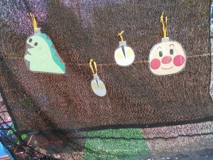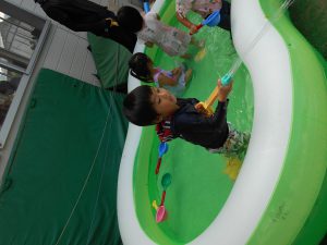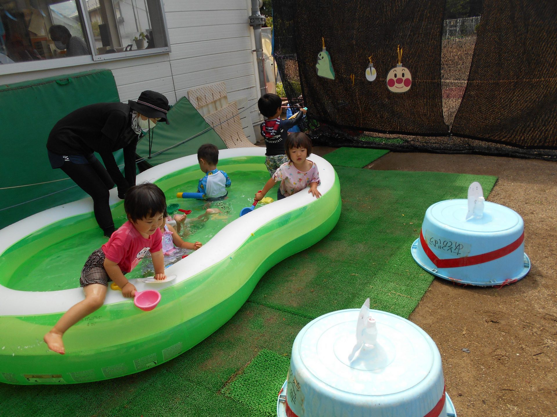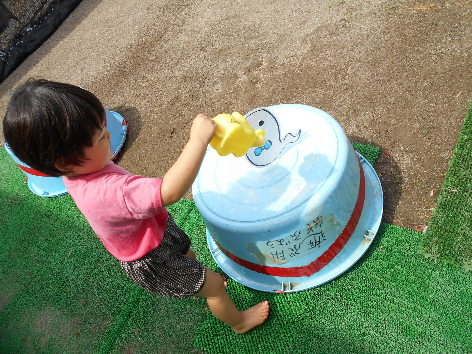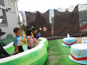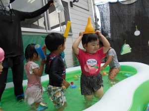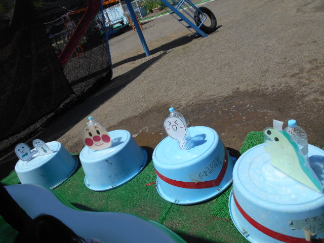 ・初めよりダイナミックに水遊びが楽しめるようになってきました。的当てを用意すると水鉄砲を使って倒そうとする子や、上手く使えない子は自分なりに工夫して楽しんでいました。自分で考え、工夫している姿を見守り、気づいたことを大切にしていきたいと思います。