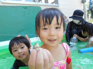 ・生き物に興味をもっている姿があります。プール以外でも戸外遊びの中で虫探しの活動に繋げていきたいと思います。