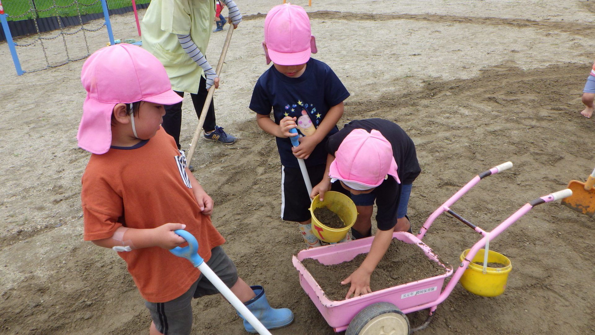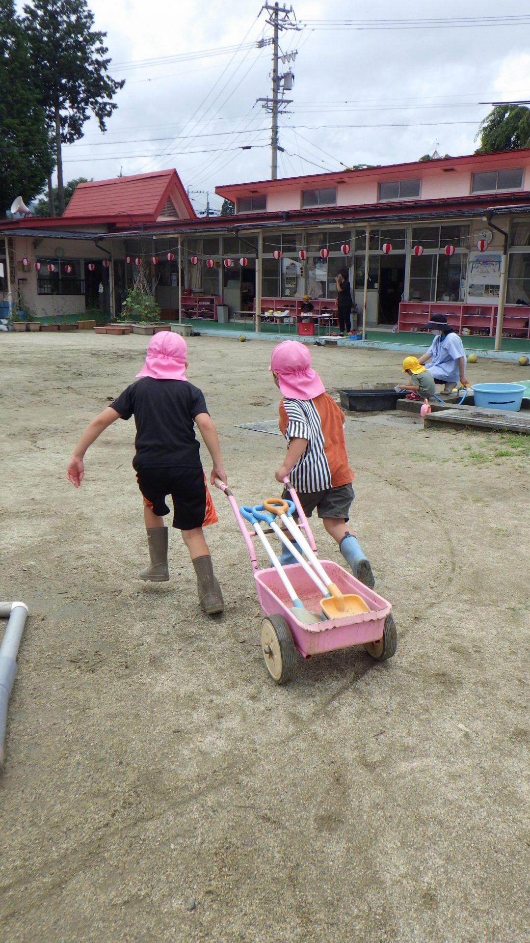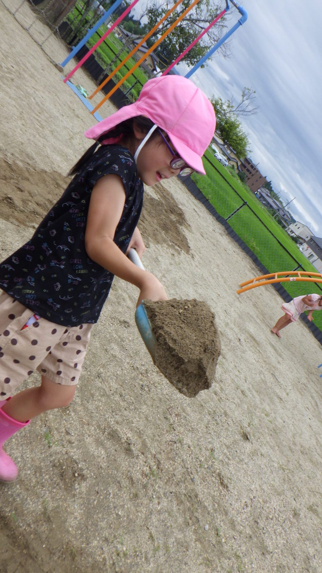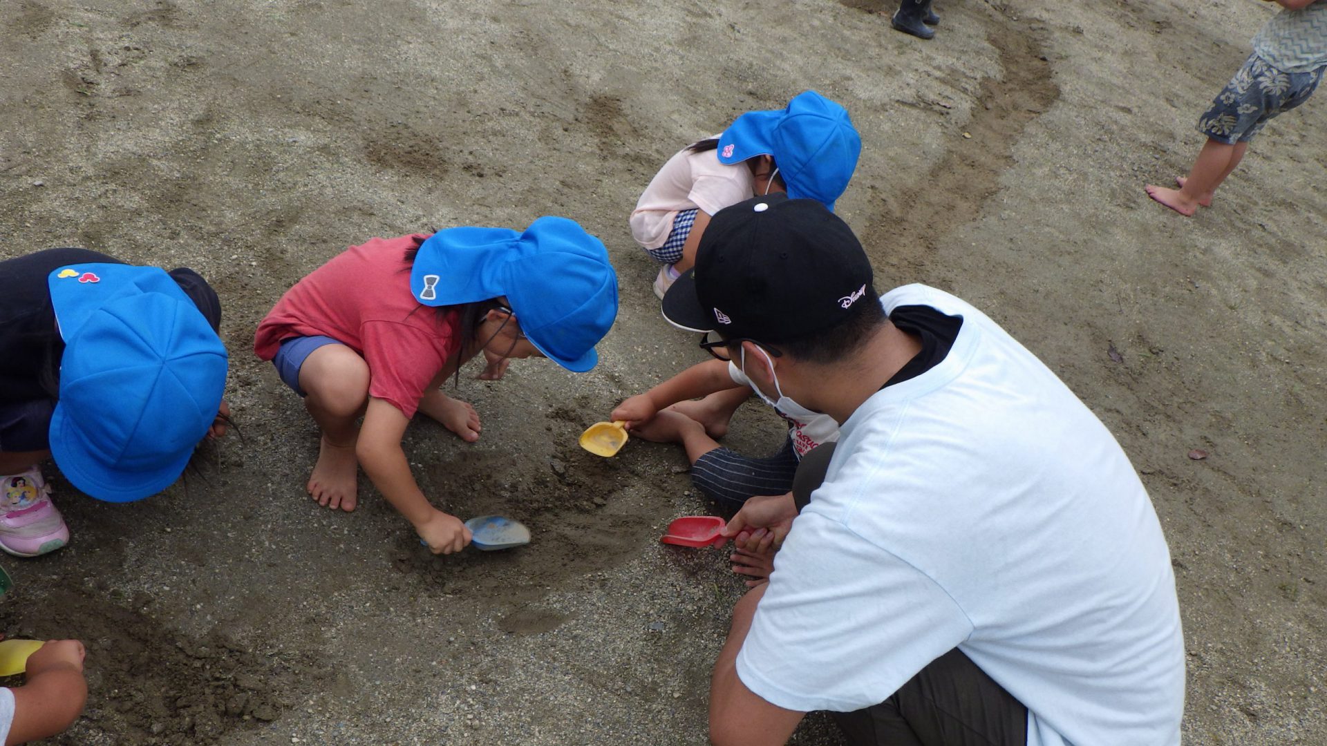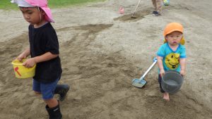 凸凹がだいぶ埋まって平らになってきた頃、使用したシャベルを集めて回ってくれている年長さんがいました。片付けもお任せあれ!頼もしい背中!!