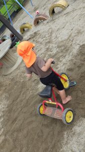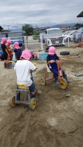 「三輪車に乗って何しているの?」よくよく見ていると…お友だちが砂を入れた所を、三輪車のタイヤを使って地ならししていました。通った後もちゃんと平らになっているか、運転しながら後ろを振り返って確認している年長ロードローラー!流石です。