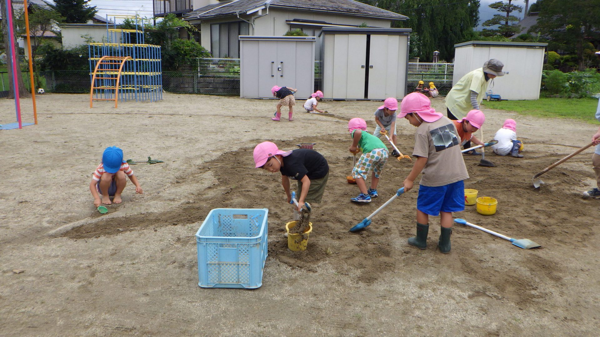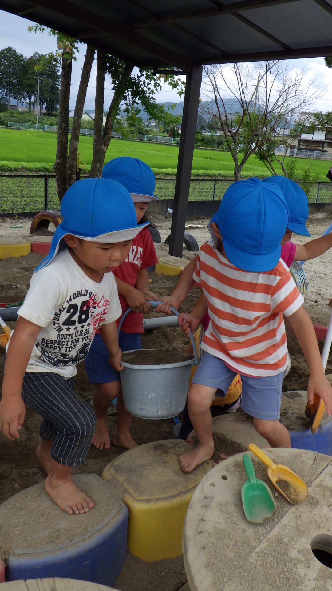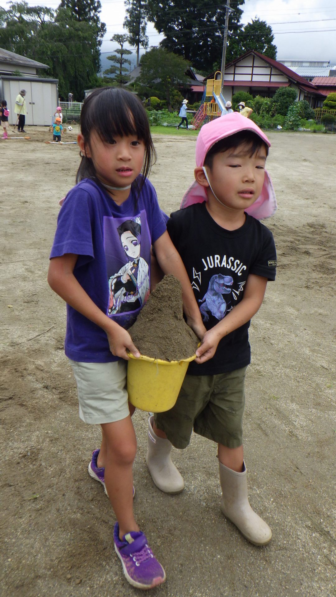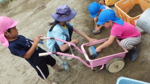夏祭りを控えたある日、年長さんが「夏祭りをやる時、こんな凸凹の園庭だと小さい人が躓いてこけちゃったり、年長の神龍が出来ん!」と気付き「皆で、園庭を埋めよう!」という事になりました。