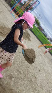 ・最後の地ならしで、自分達の足で踏み固め「フワフワしてる!」「あれ?ちょっと硬くなった?」と、園庭(砂)の硬さに気づきました。