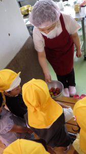 採れたミニトマトは、給食室に届けます。「ありがとね。今日の給食に入れるでね」と声を掛けてもらうのも嬉しいお手伝い。