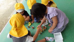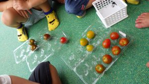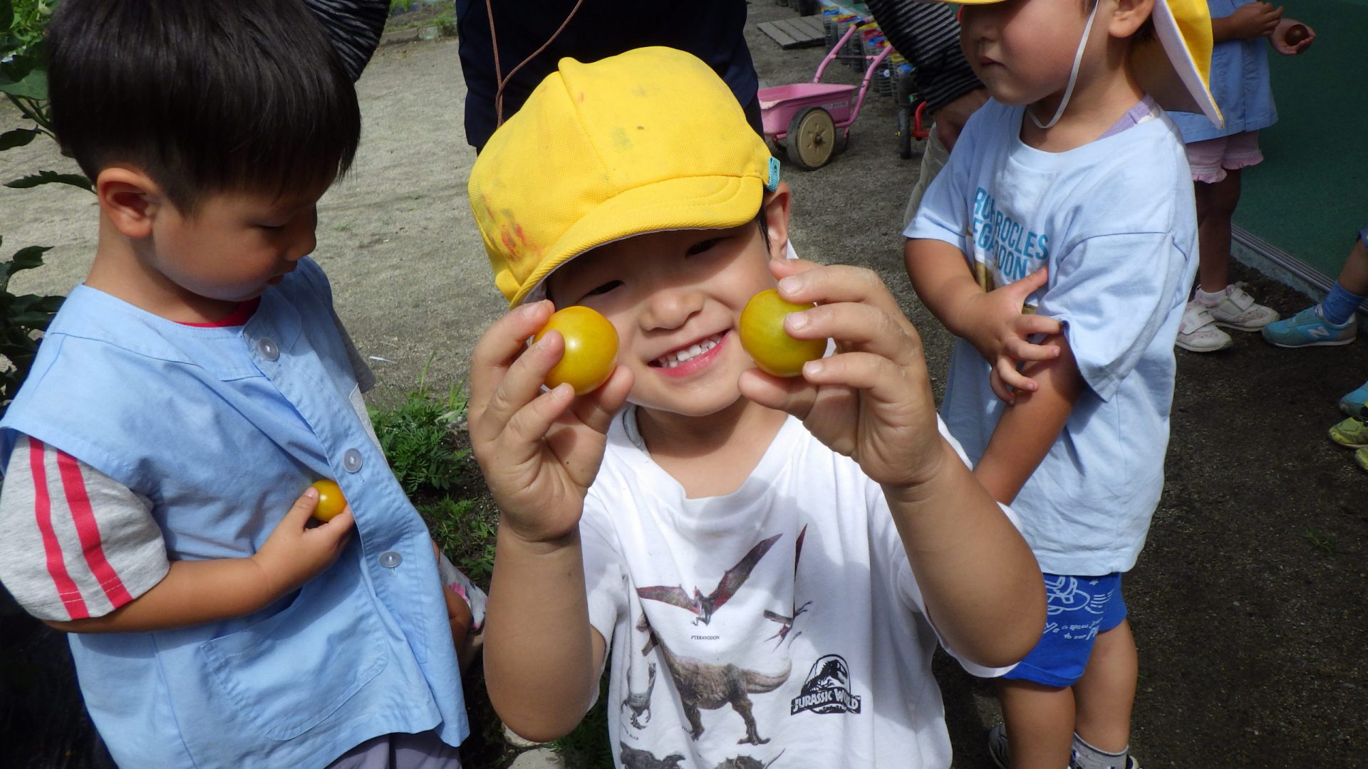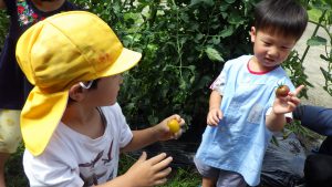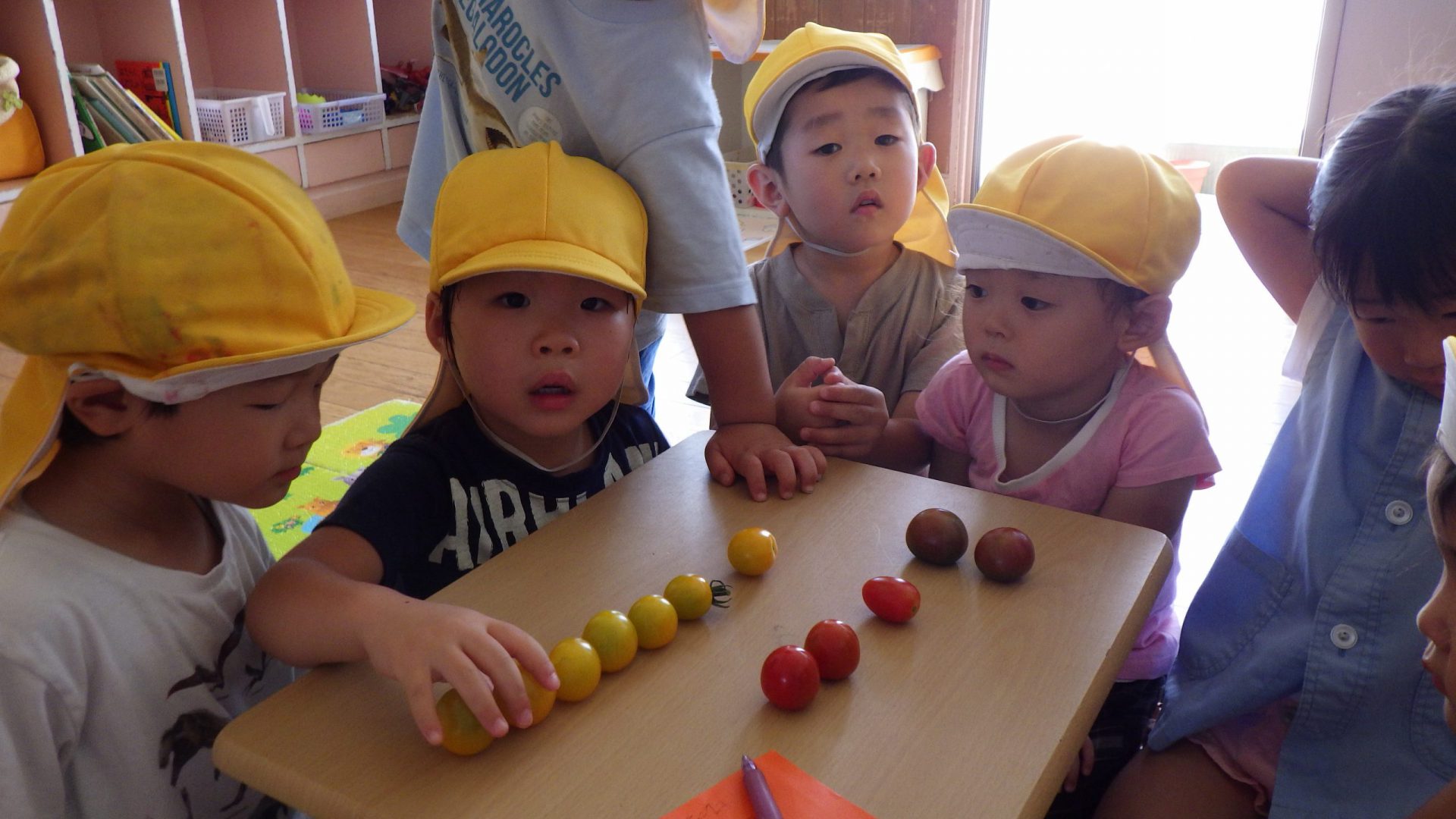 ・赤、黄、茶の3色と細長い形の計4種類のミニトマトに名前をつけ栽培した年少さん。緑の苗木を見た時は「何だろう?」「草?」くらいの反応でしたが、苗の背丈がぐんぐん伸び、実がつき、色が変わっていく変化を目の当たりにし、自分の手で収穫すると一気に興味と関心が膨らみました。また虫がついたことも自然の摂理…子ども達の興味がそそられました。食卓に並ぶミニトマトを見るだけでは、ここまでの興味や関心を持つことは難しいのでは、と思いました。