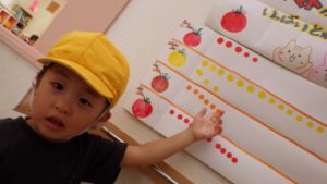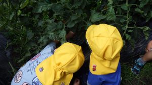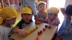 ・色や形の変化、また数にも年少さんなりに理解できる方法を探って提案したことで、自然と多い少ない、大きい小さい等にも関心が向きました。昨年の未満児時代までは緑のうちに採ってしまう事も…「色が変わったらね」を聞いて、楽しみに色の変化を待てる力もついたかな。