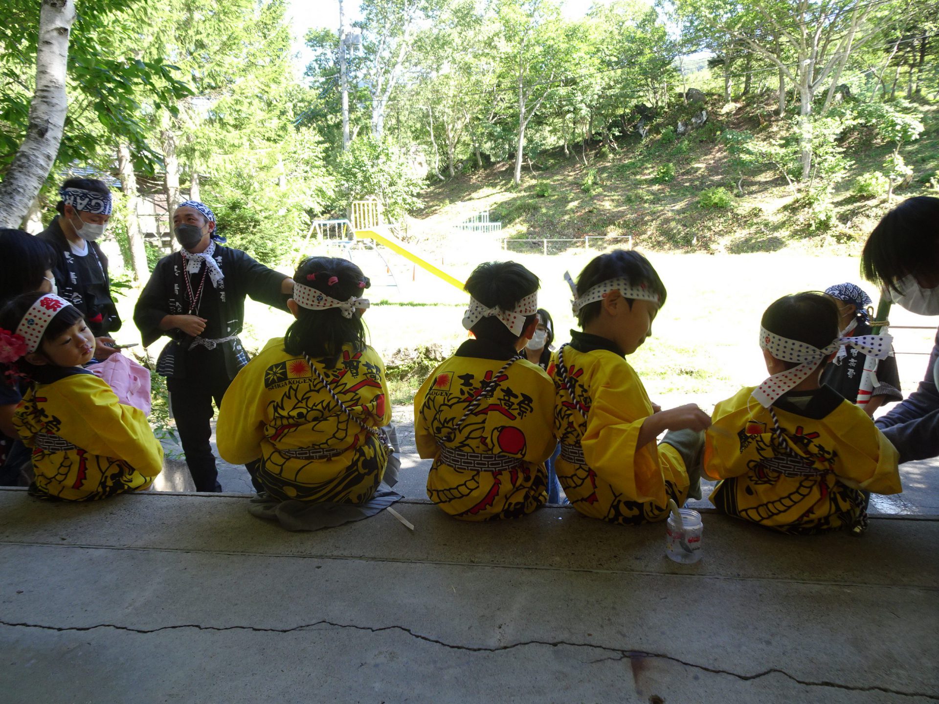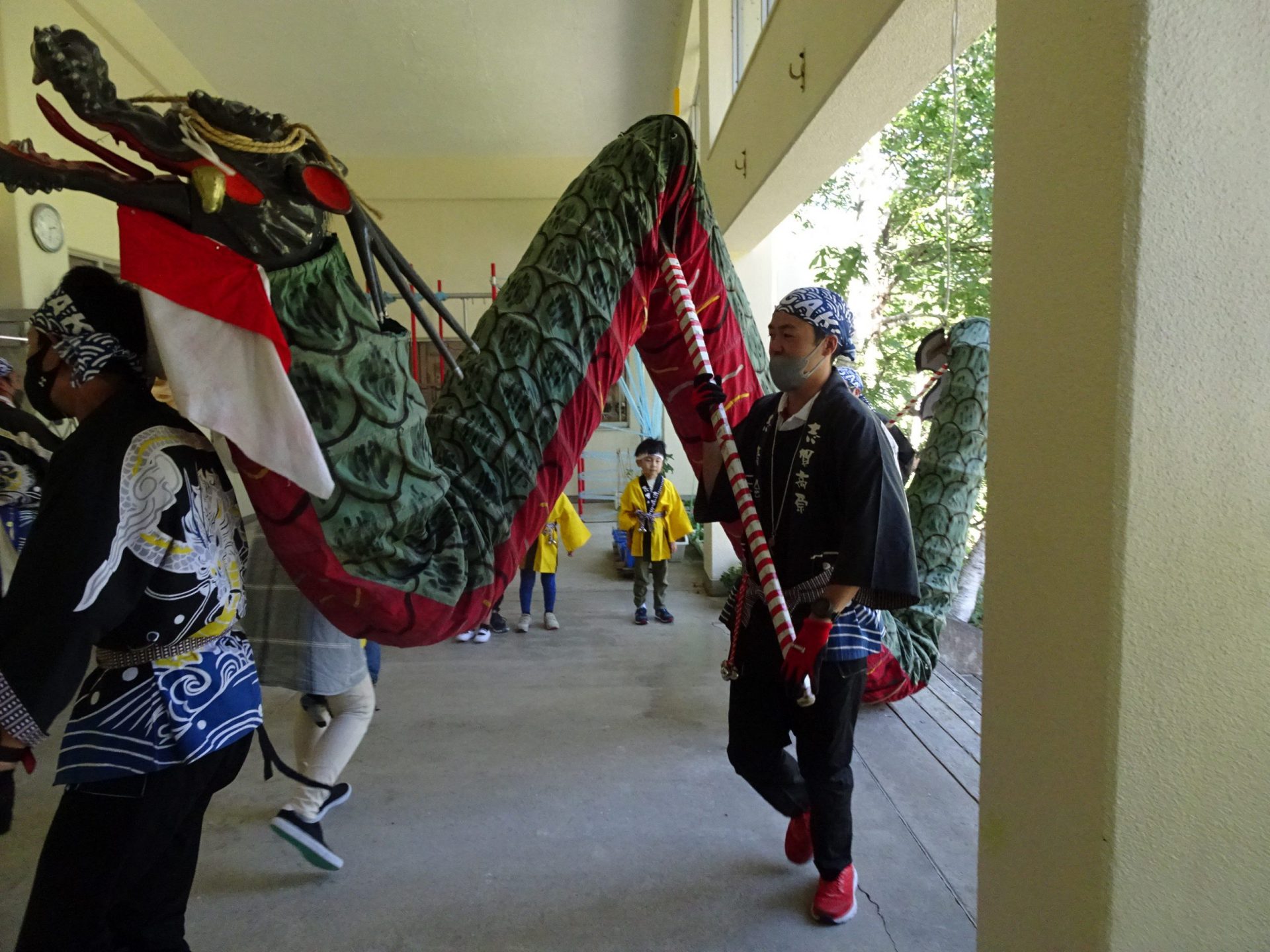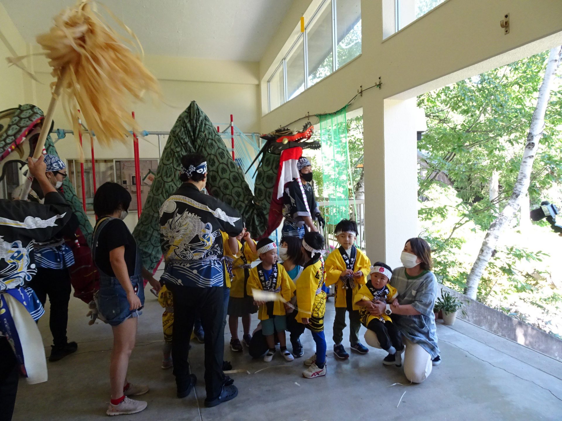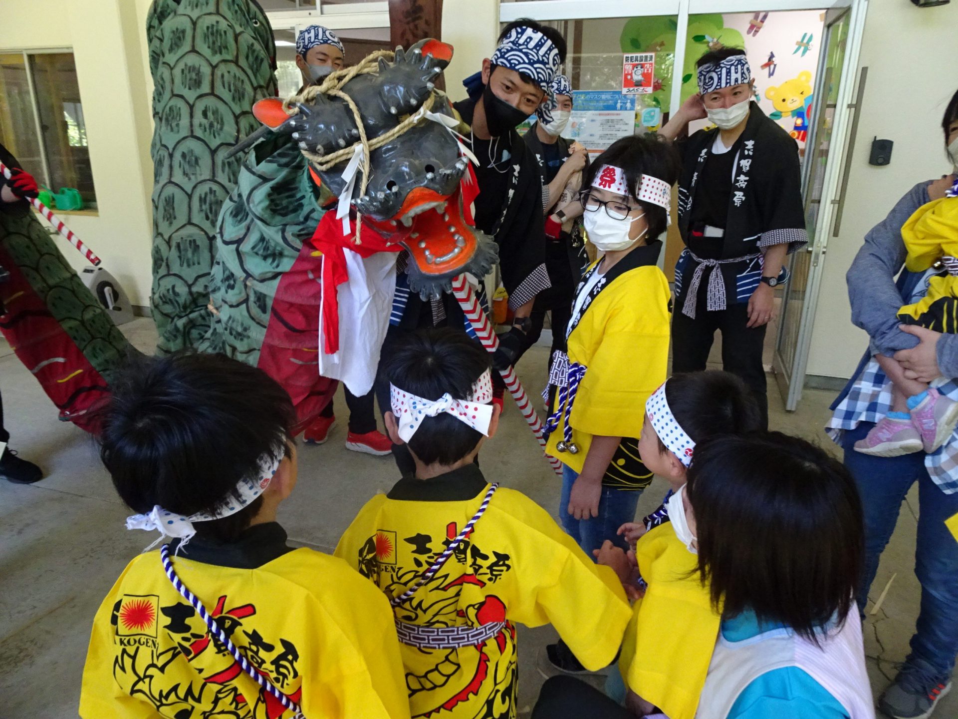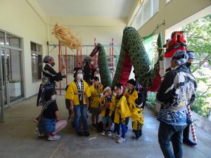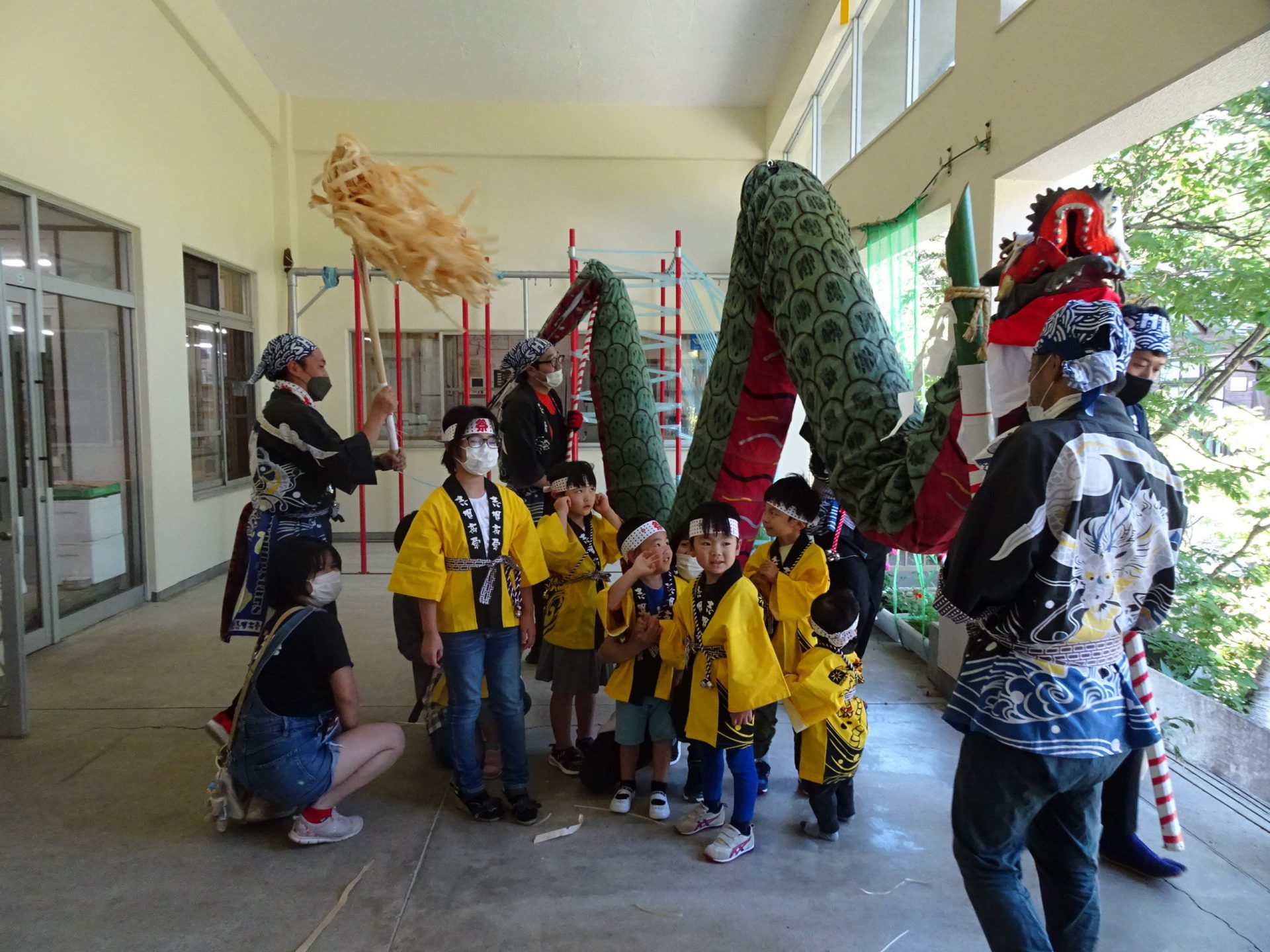 3年ぶりに保育園にも大蛇のお練りがやって来ました。法被を着た子供たちが迎えます。