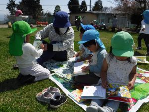 芝生の上で絵本を見たり
