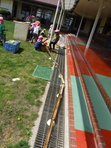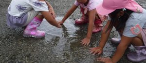 水たまりから細い川を作って水の流れを見ている年長さん。