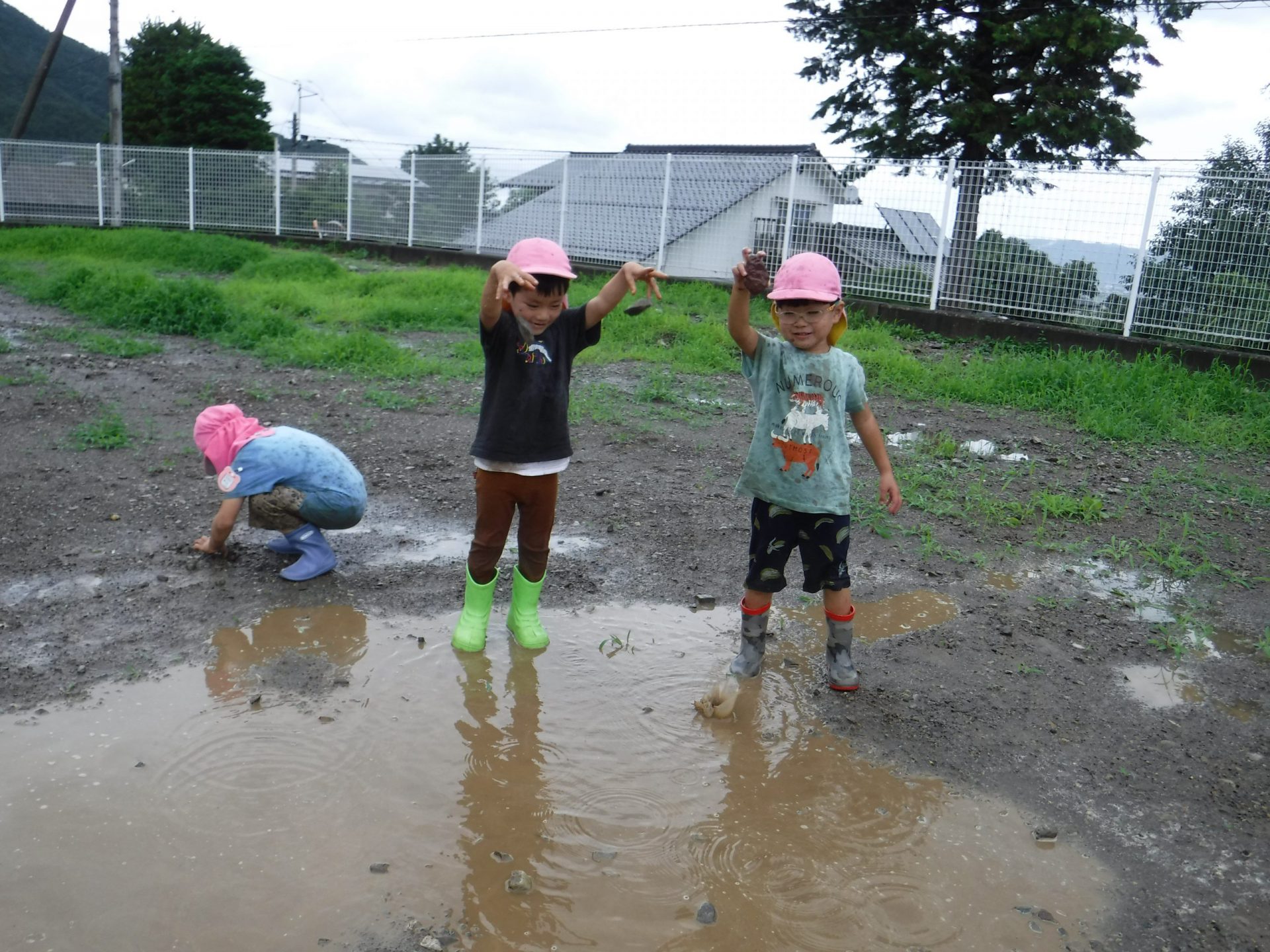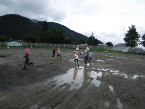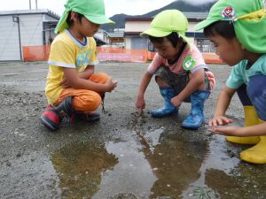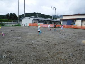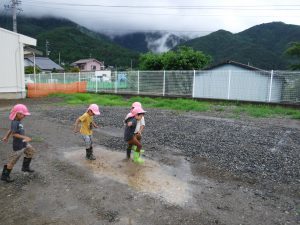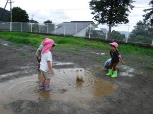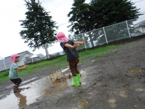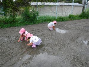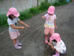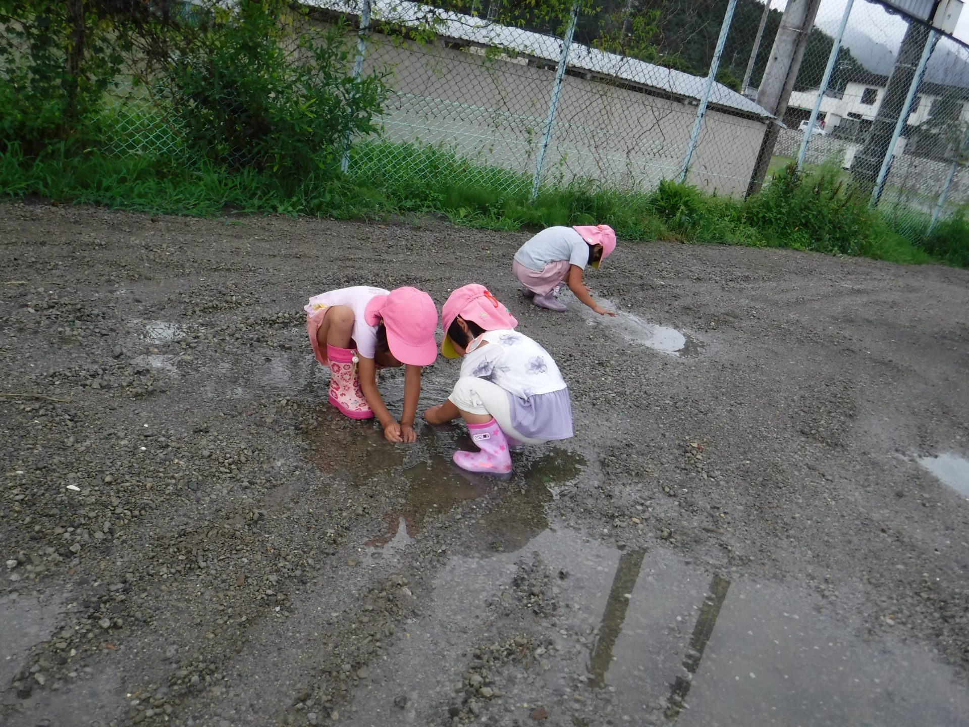 雨の日が続いていたので、雨がやんだ合間に広い外で少し走れたら・・・と思い外に出たところ、子どもたちはいろいろな遊びを見つけ発見をしていました。