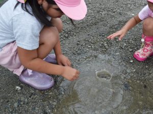 こちらは石を投げて水しぶきの研究