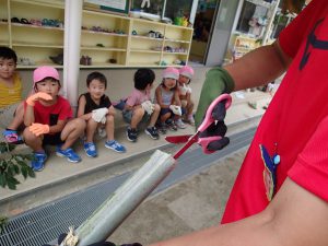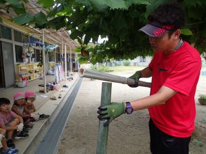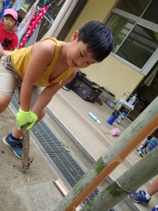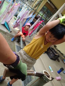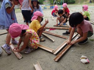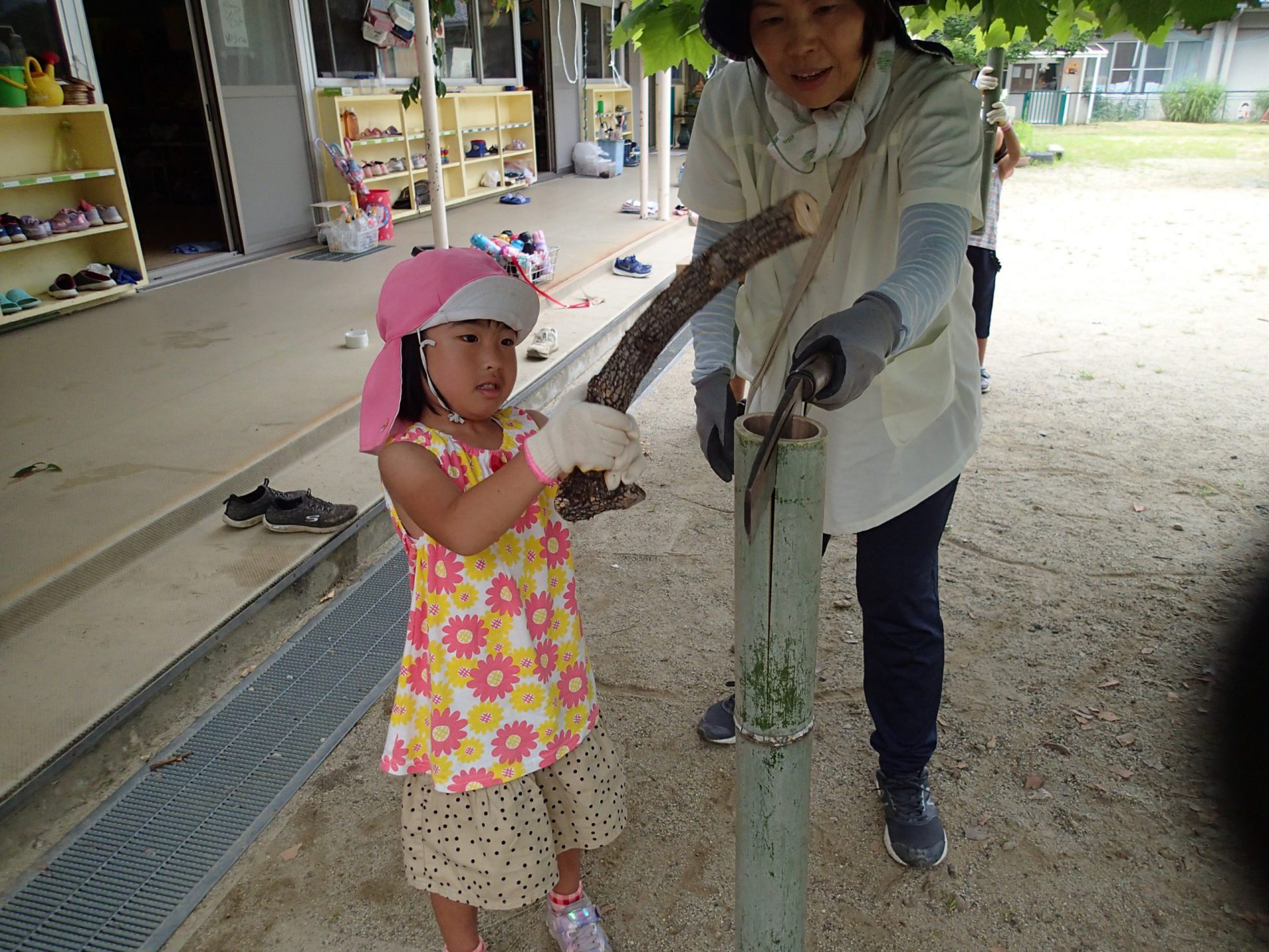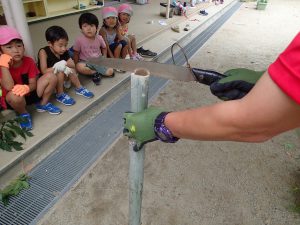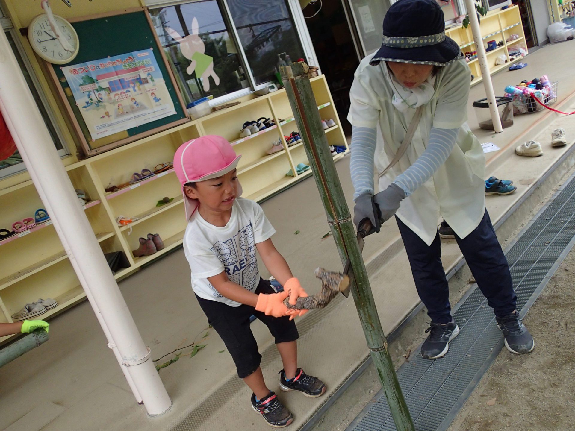 ・次はカナヅチを使って節をとる活動に向かっていきます。完成も近づいてきているの子ども達の期待や達成感を大事に保育を進めていきたい。