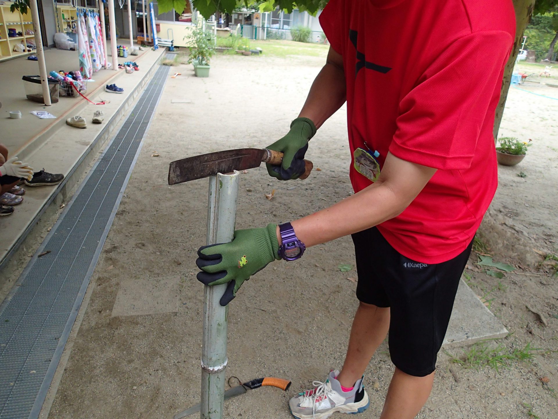 子ども達も始めは緊張しながら叩いていくのでうまく鉈が入っていかず「ちょっとむずかしいなぁ~」
