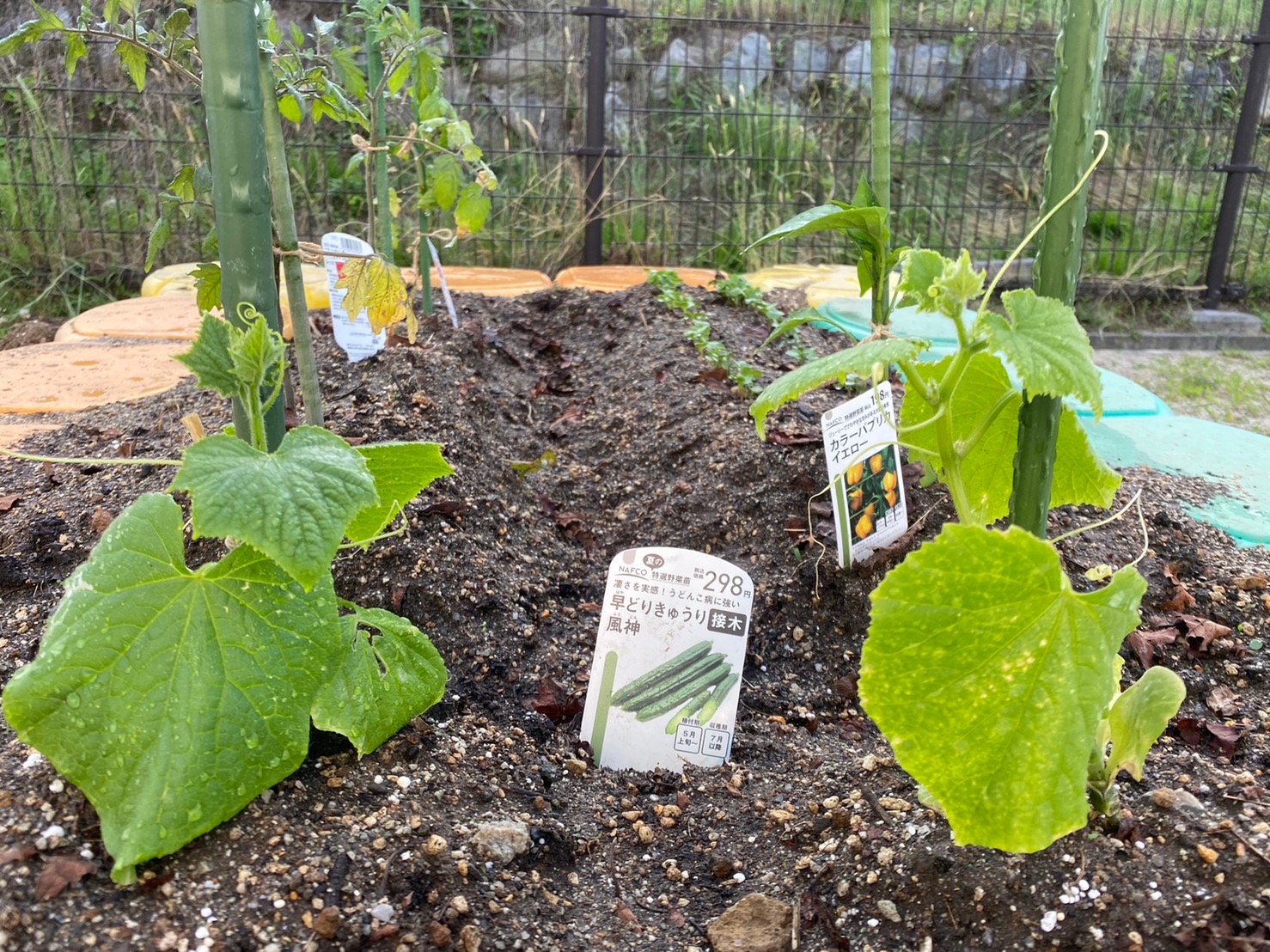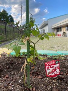 まずは、子ども達と話し合って、“トマト”と“きゅうり”の、苗を保育園の園庭の隅にある、畑に植えました!