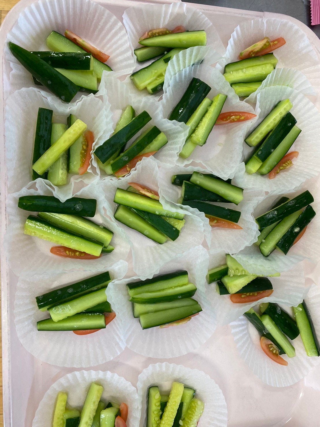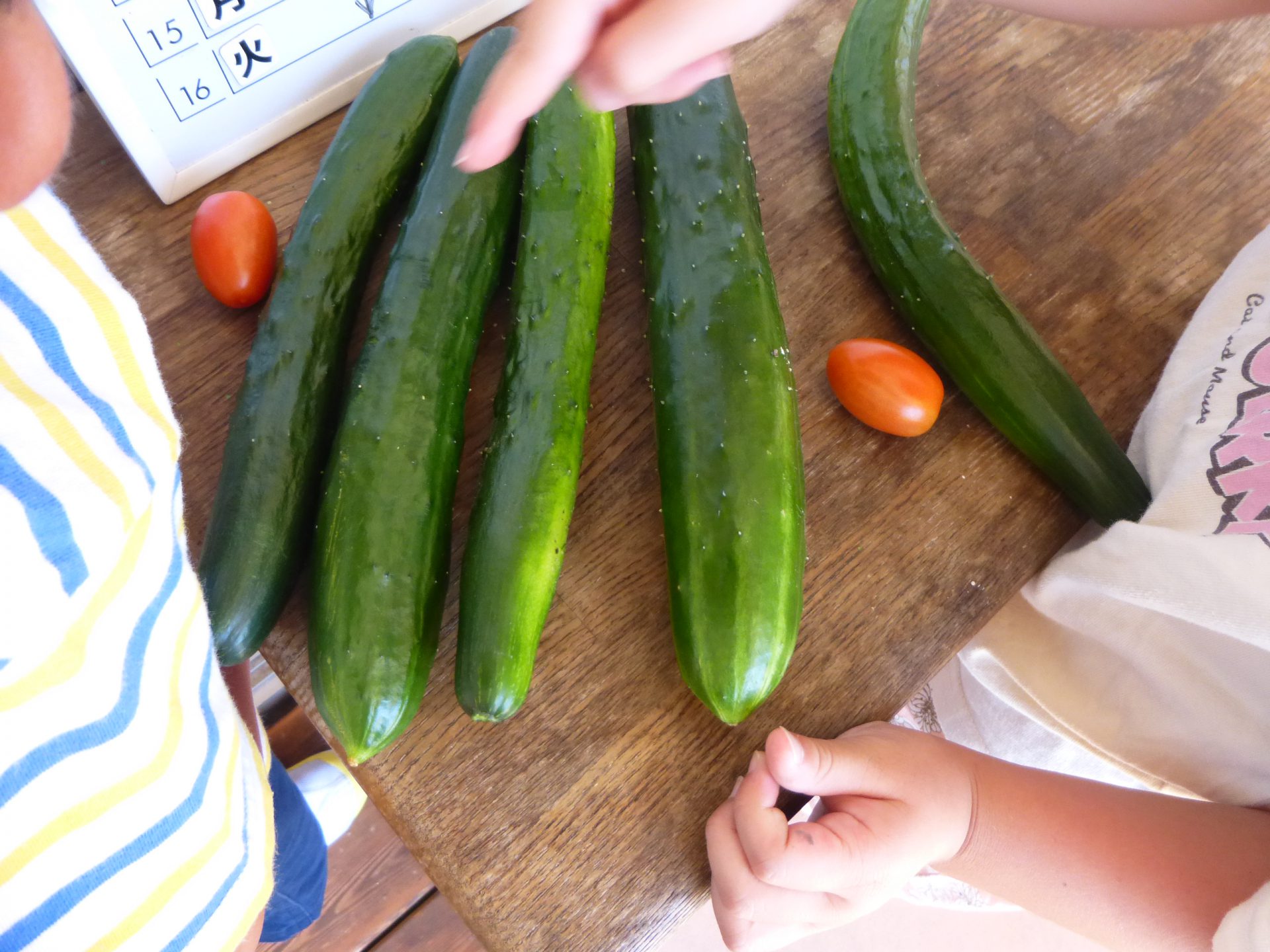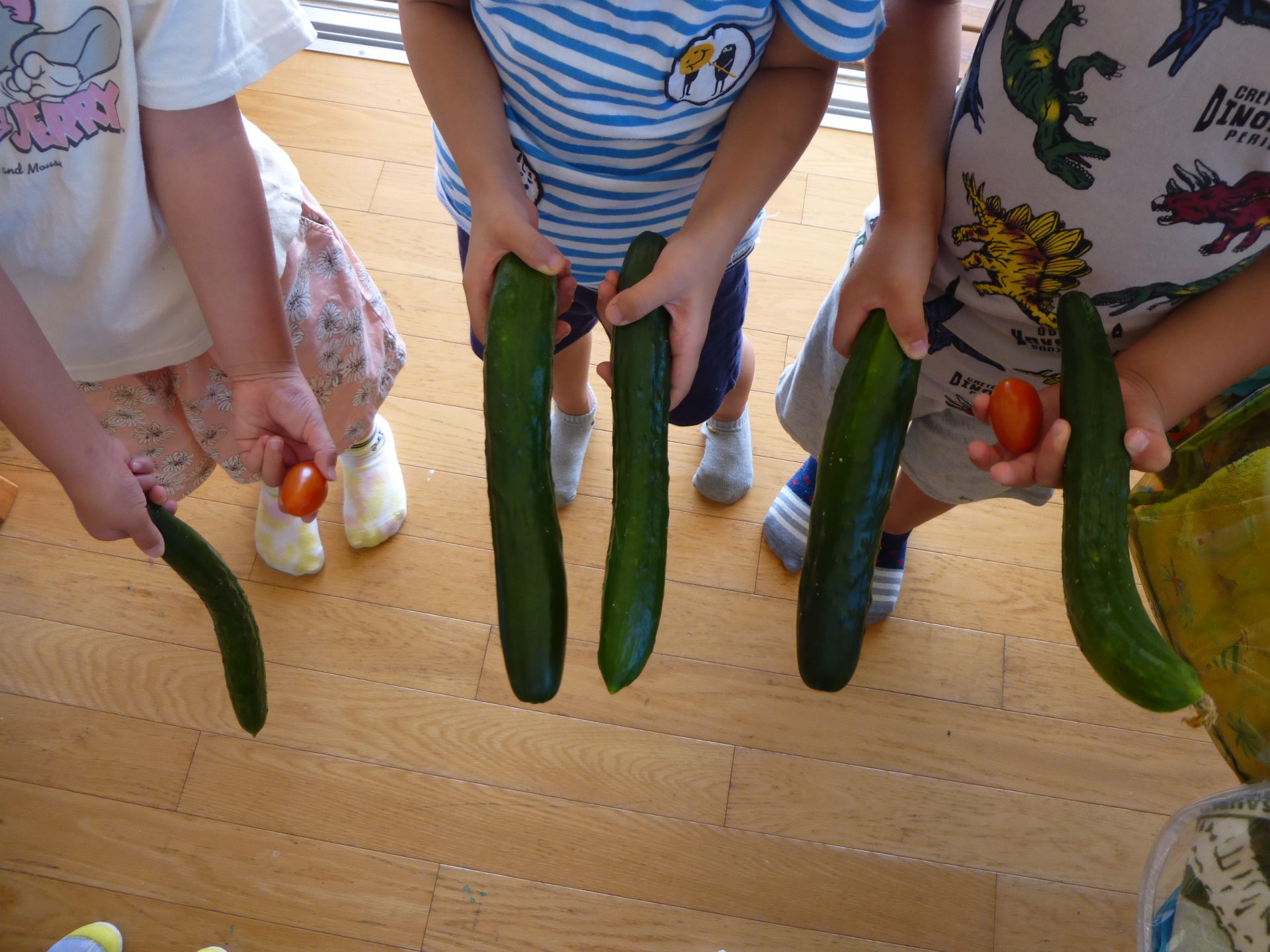 真っ赤なトマトに、大きなきゅうり!! 給食の先生にお願いをして、収穫した日の給食に入れてもらいます。